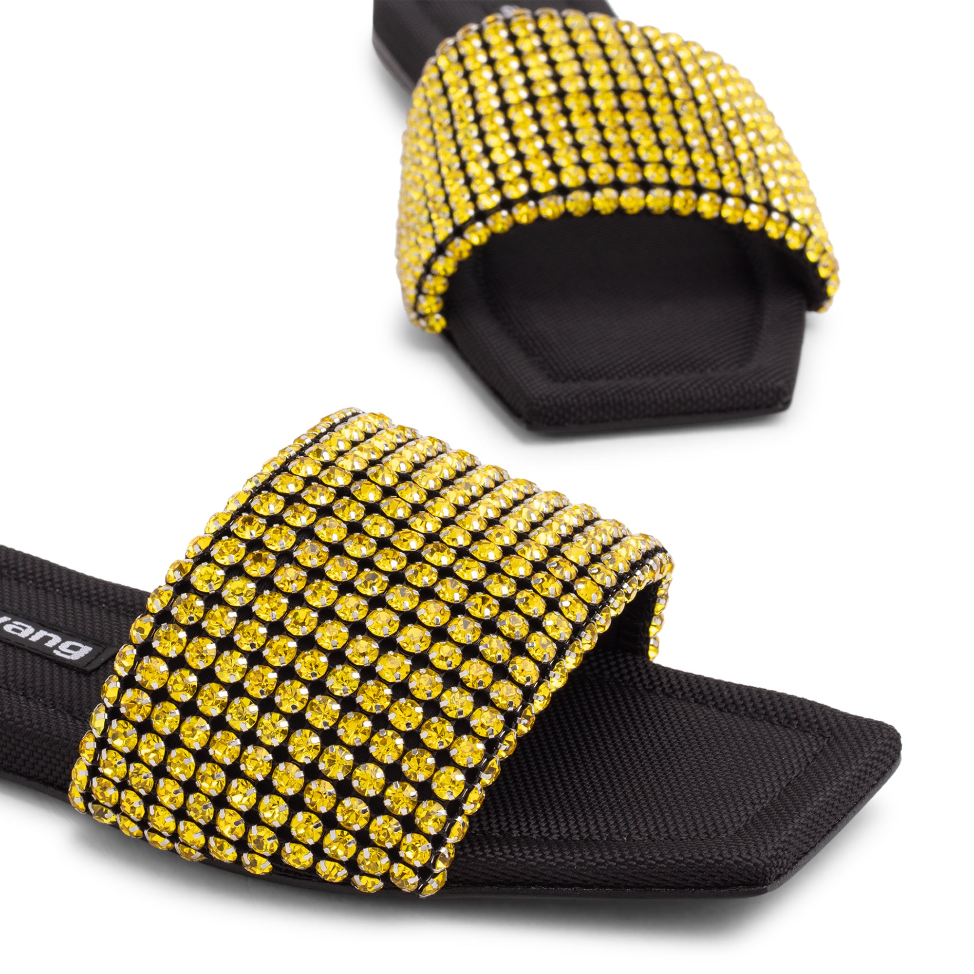Sienna Crystal square toe slide sandals with a padded foot-bed and crystal embellished top strap. Logo print detail at heel.