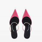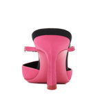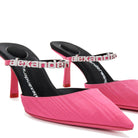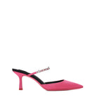 Mid-heel mule with crystal embellished logo sliders at straps in black viscose.