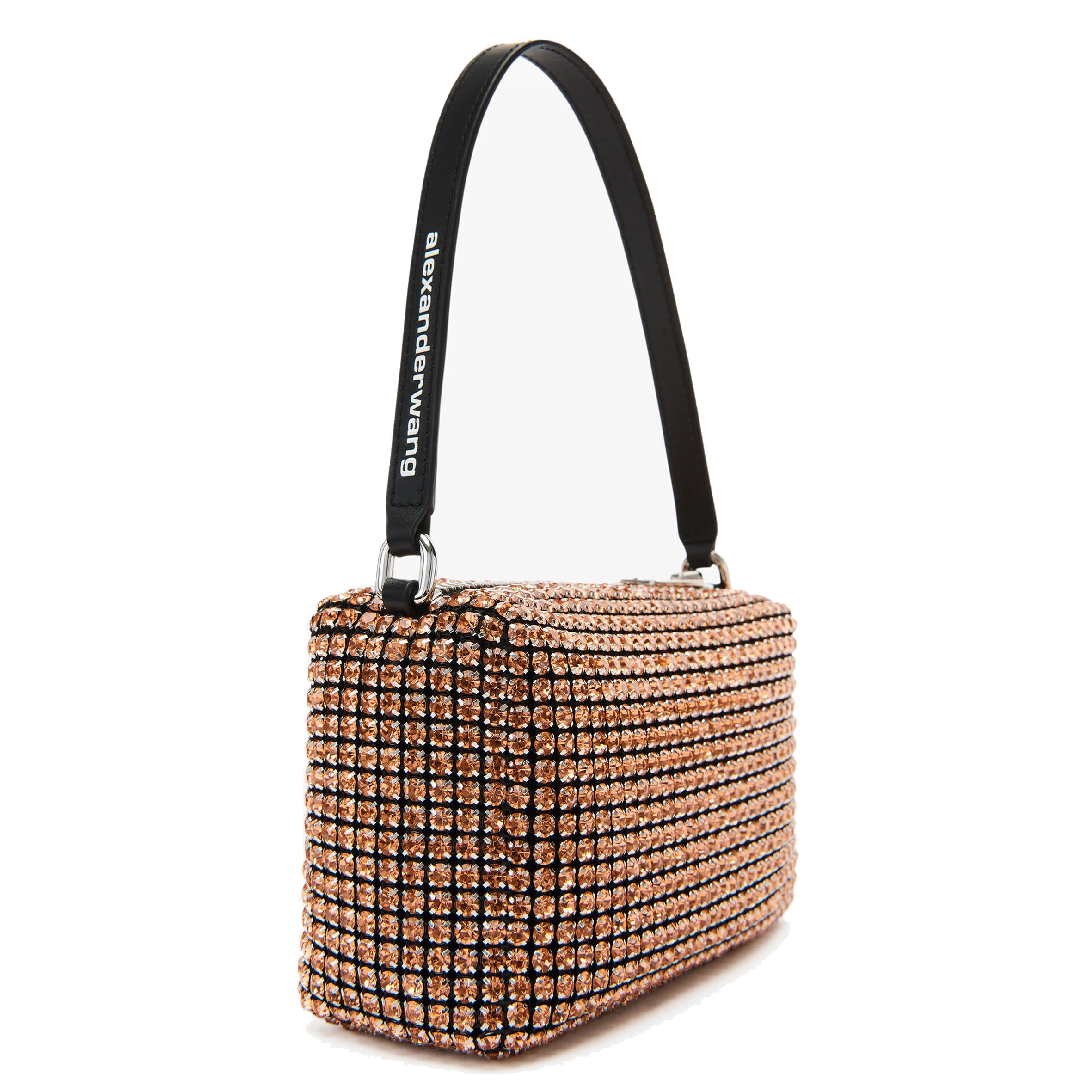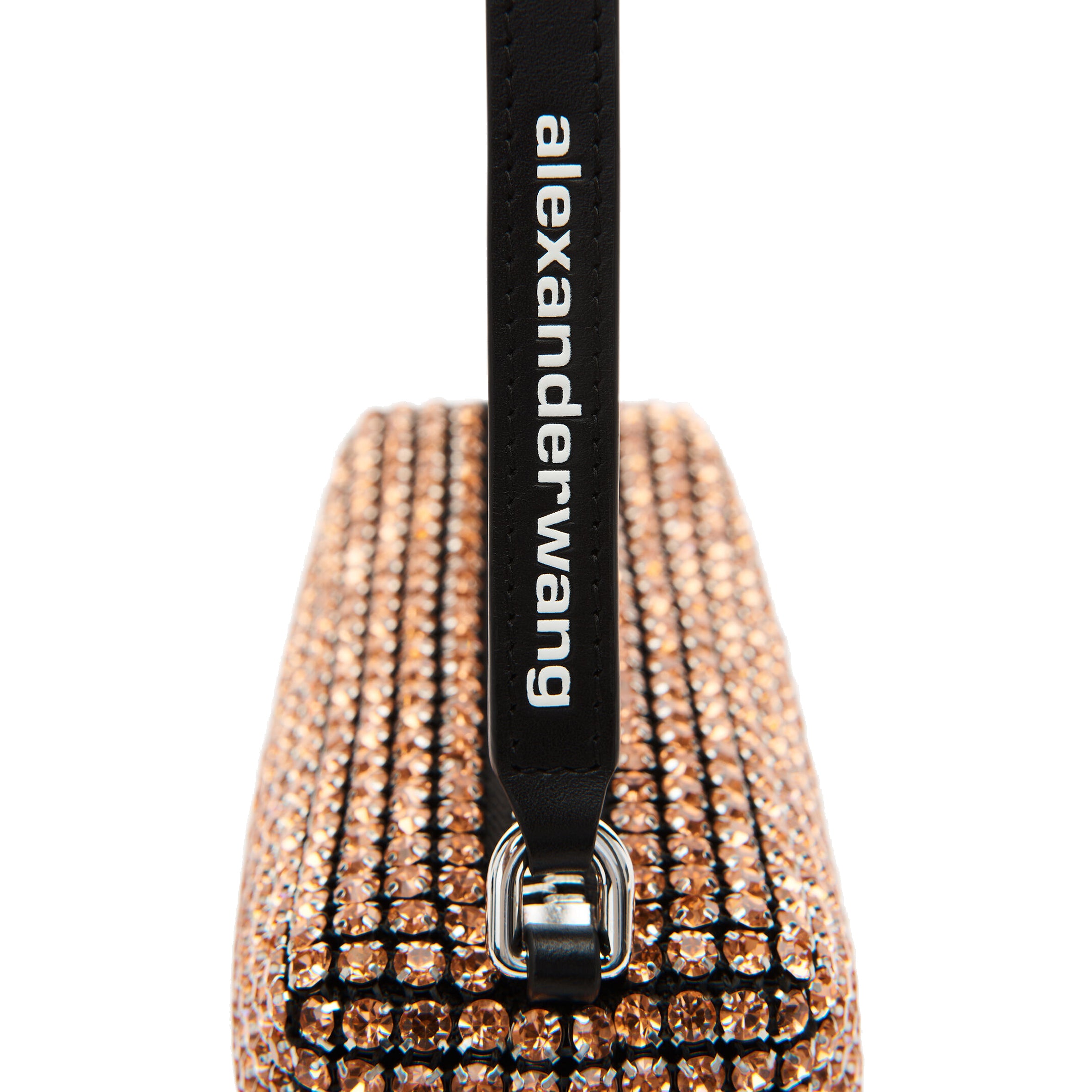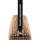 This medium pouch features crystal glass rhinestone embellishments and a statement zipper. The interior lining is made from nylon with an interior card slots. The handle is imprinted with the logo.