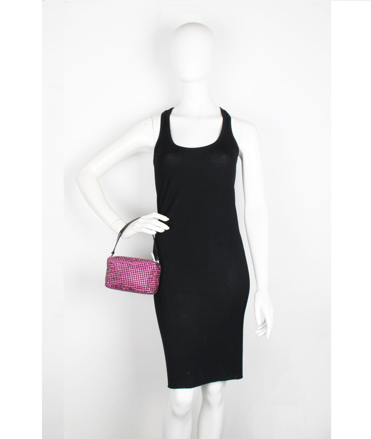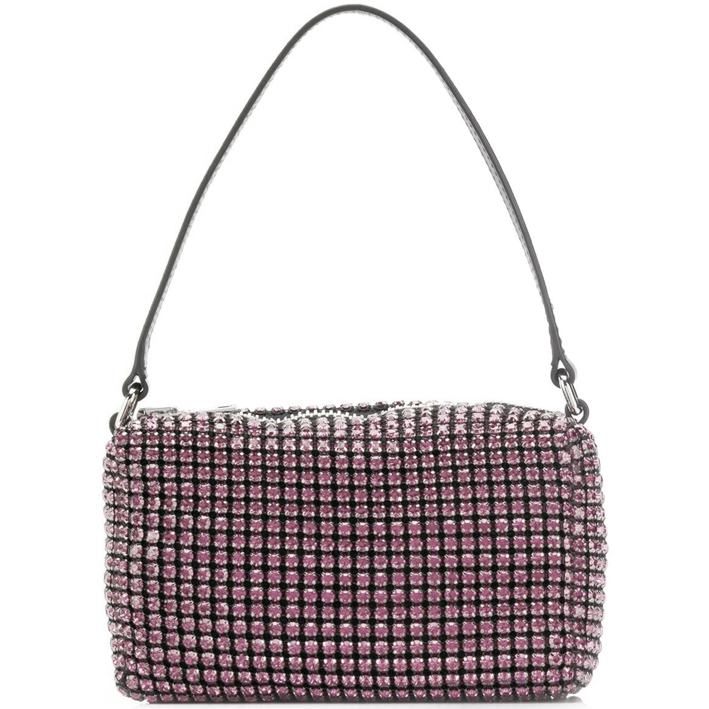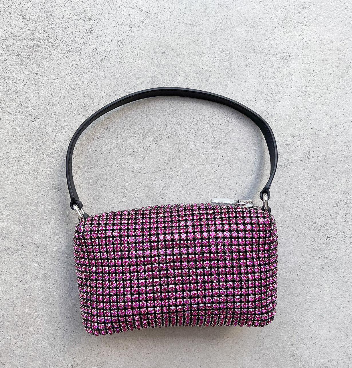 This medium pouch features crystal glass rhinestone embellishments and a statement zipper. The interior lining is made from nylon with an interior card slots. The handle is imprinted with the logo.