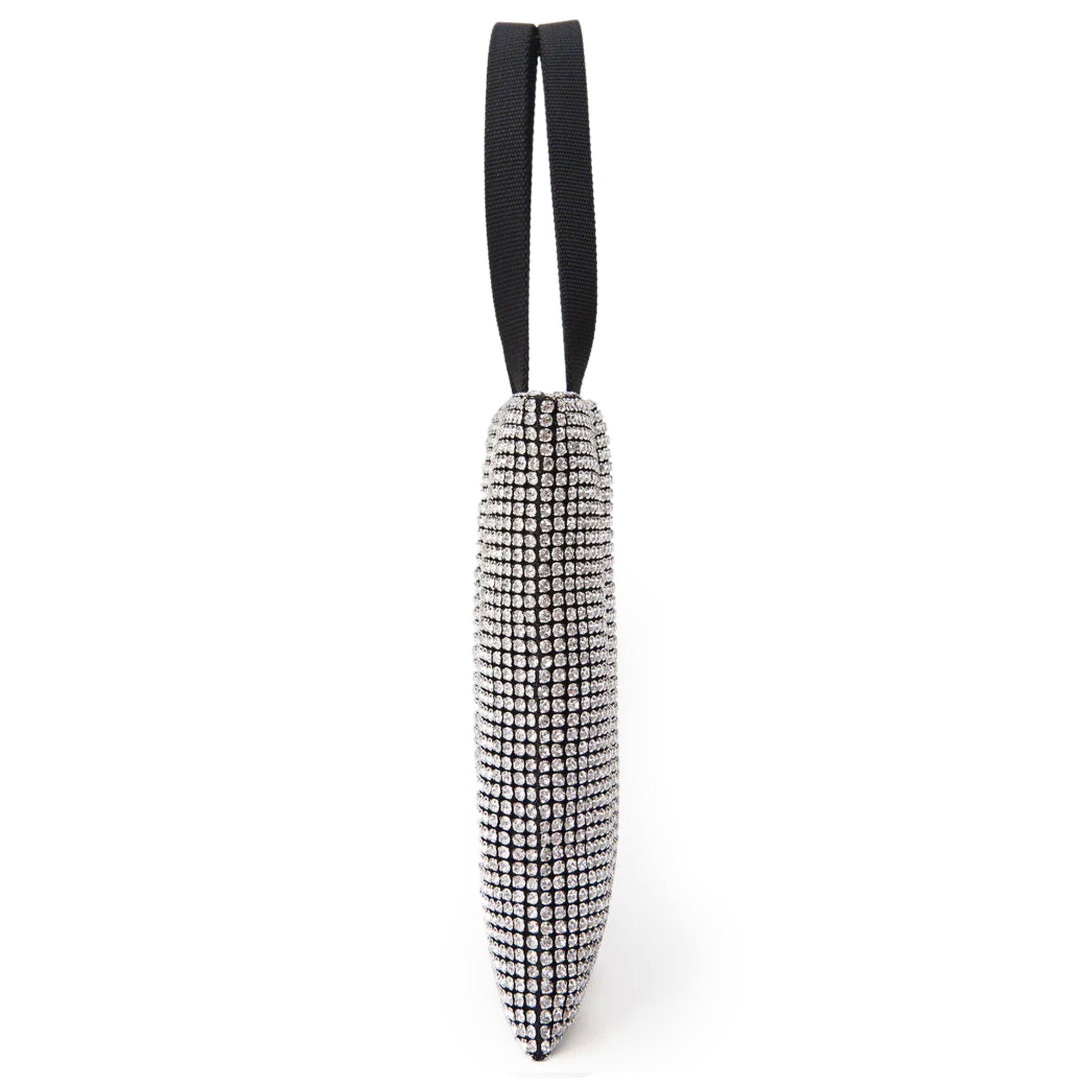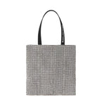 Miniature tote in quilted white rhinestone chain mesh with black webbed nylon top handles.