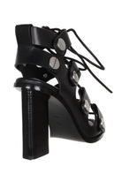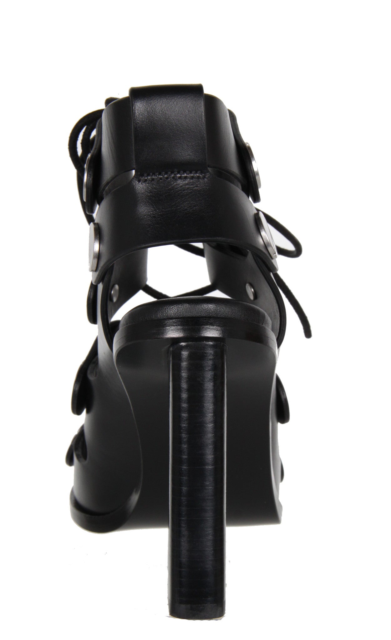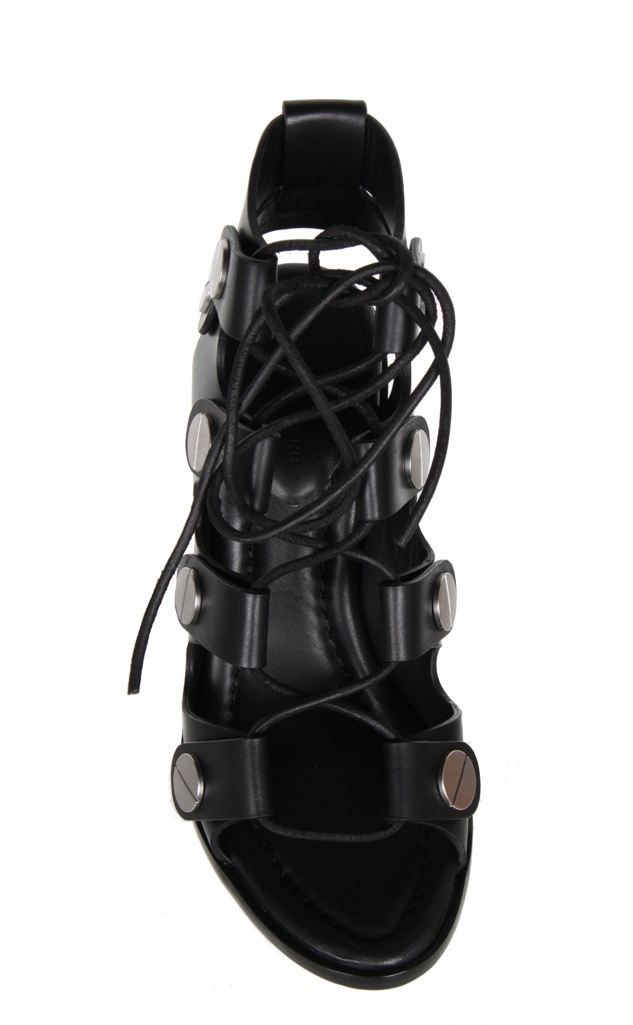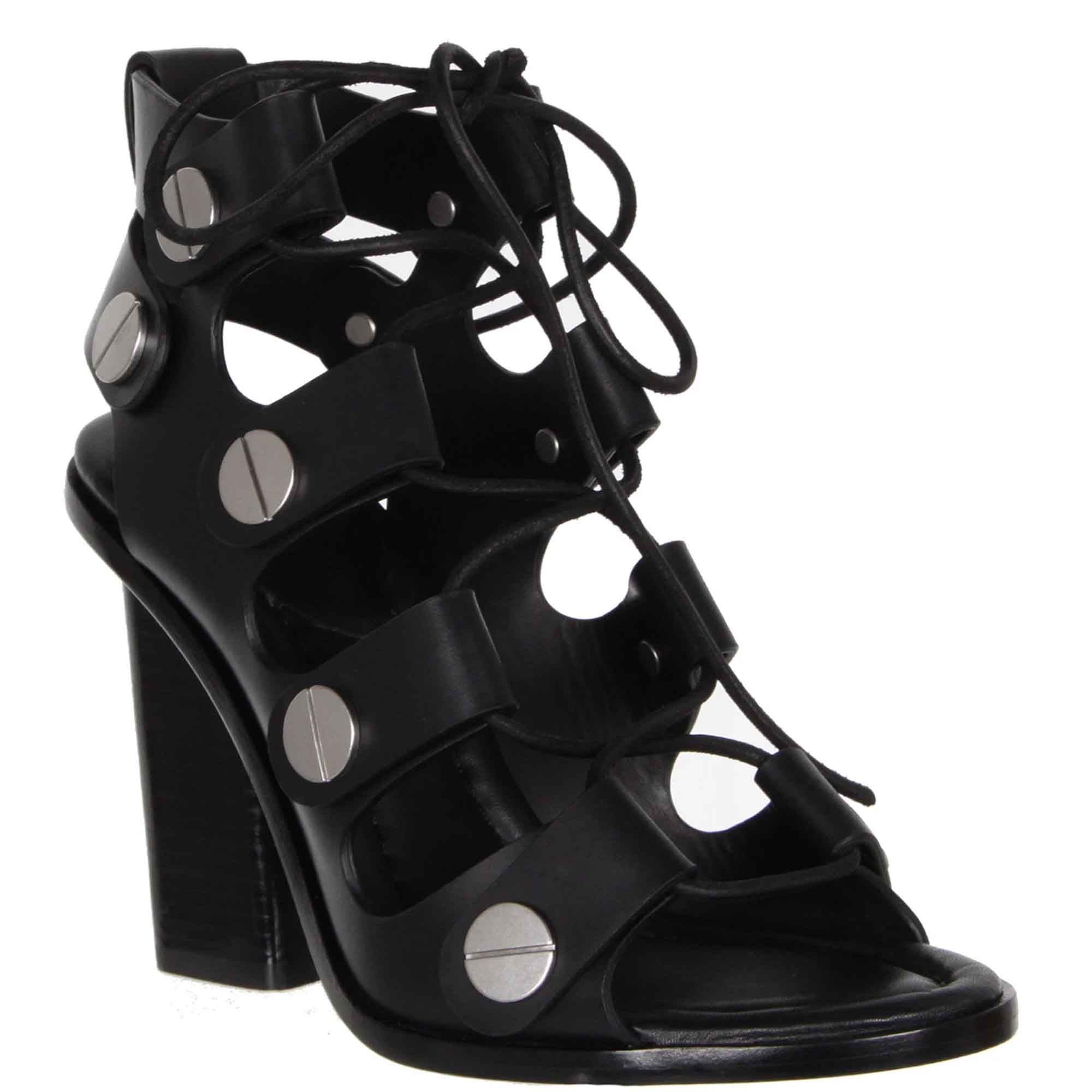 Alexander Wang's Ilse lace up heel feature screw shaped rivets for a tough luxe look that can be worn both day and night. The calf nappa leather sandals have a round open toe, adjustable ankle strap with pin-buckle closure and a stacked triangular heel with a completely cushioned insole.