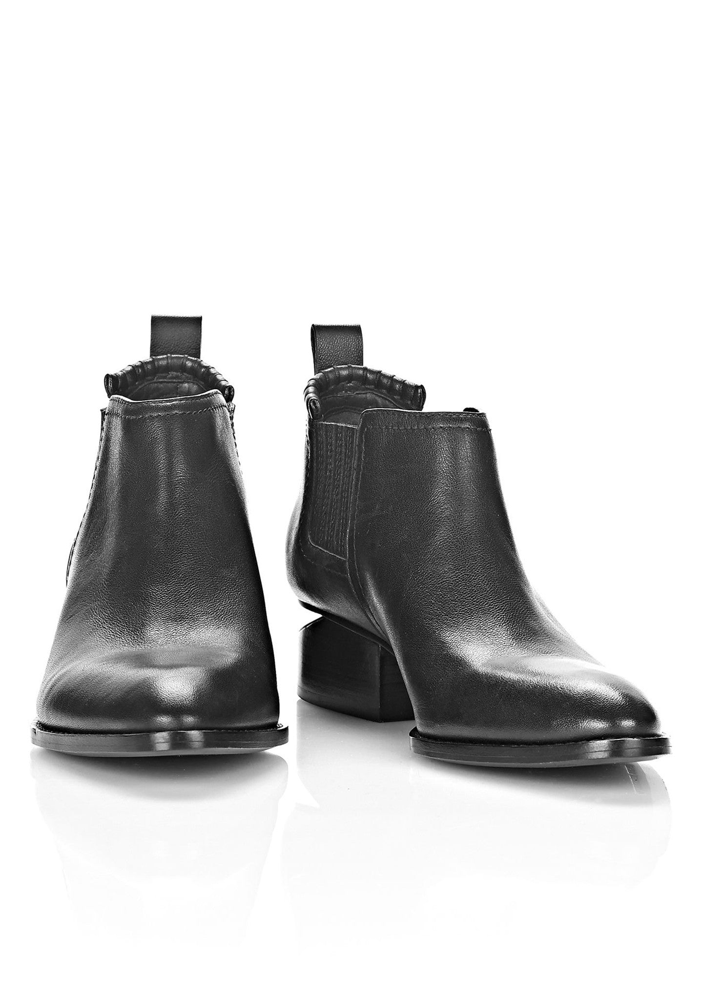 Heeled oxford boots with elastic finger gores and box stitch detail at back top-line. Signature cut out heel with a matte black metal plate. Leather stacked heel and buff leather out sole.