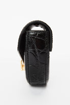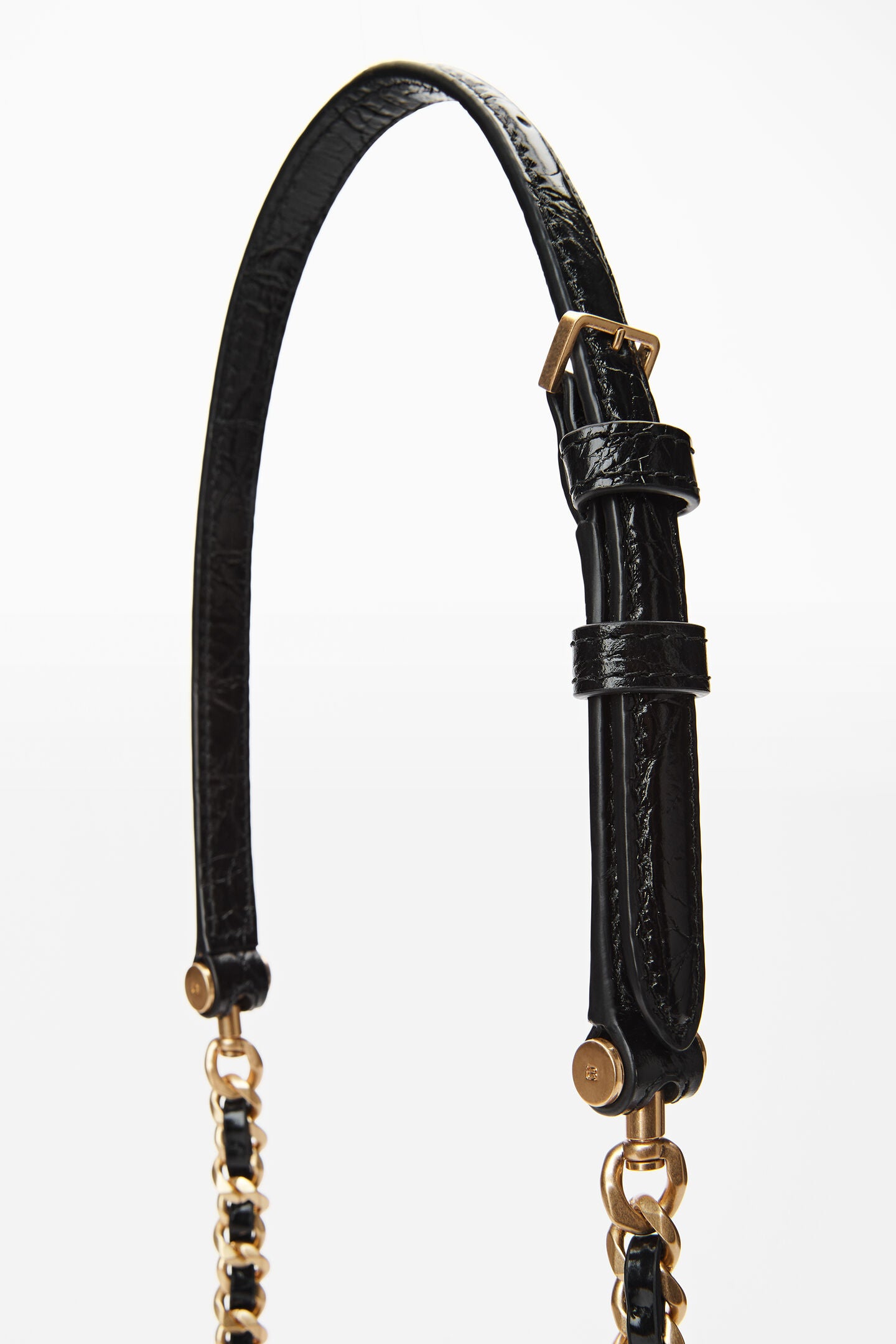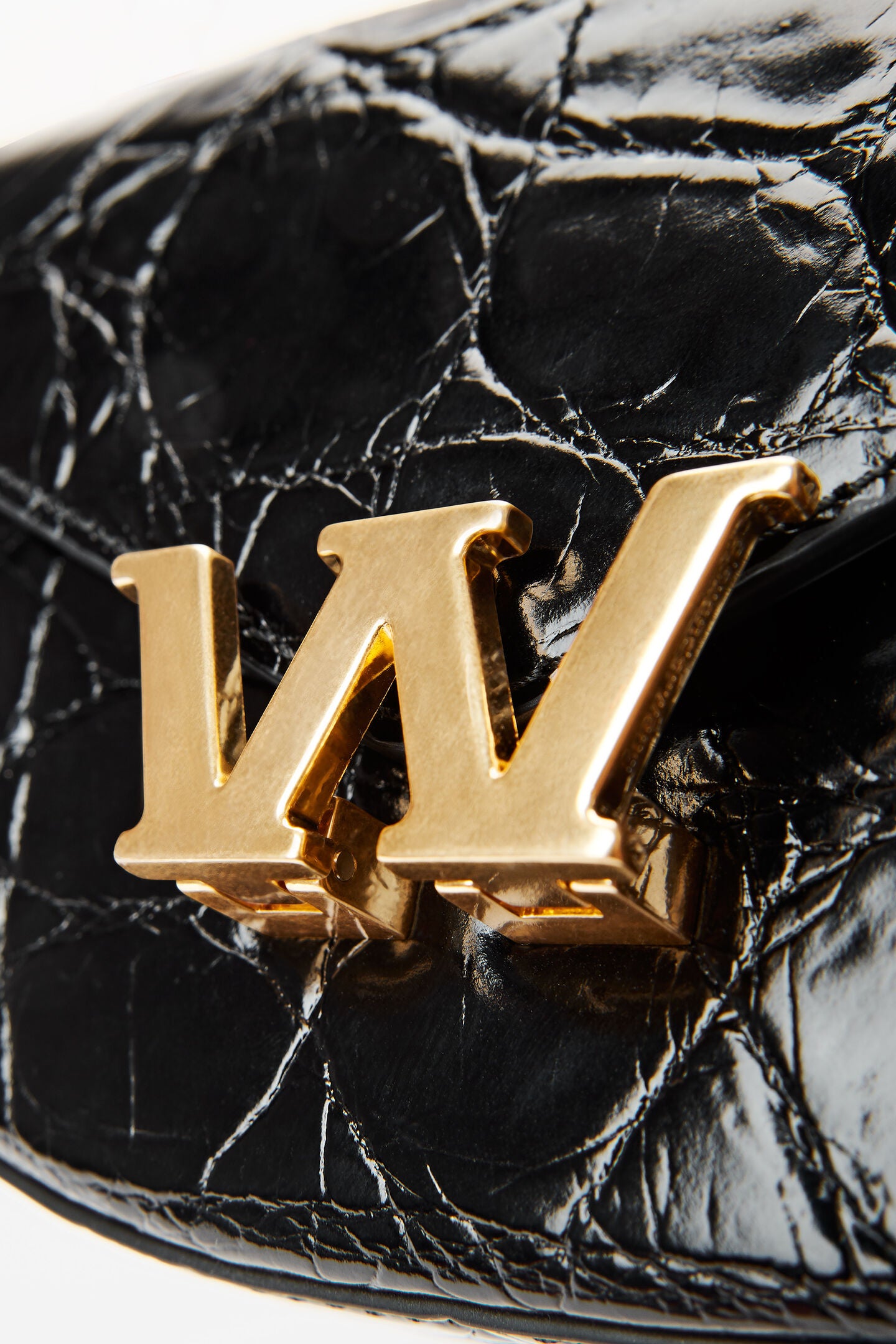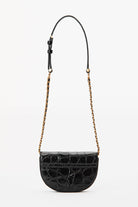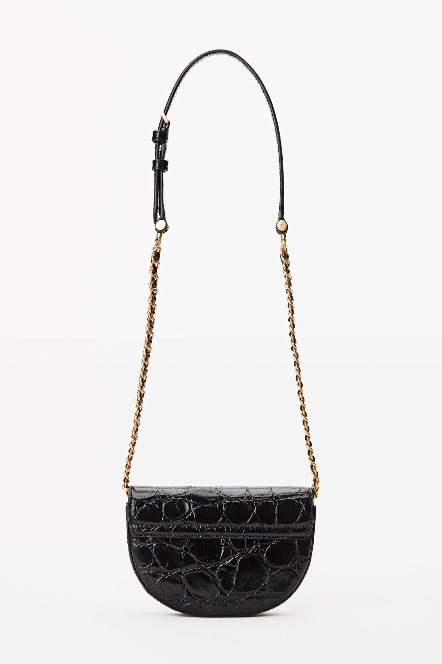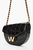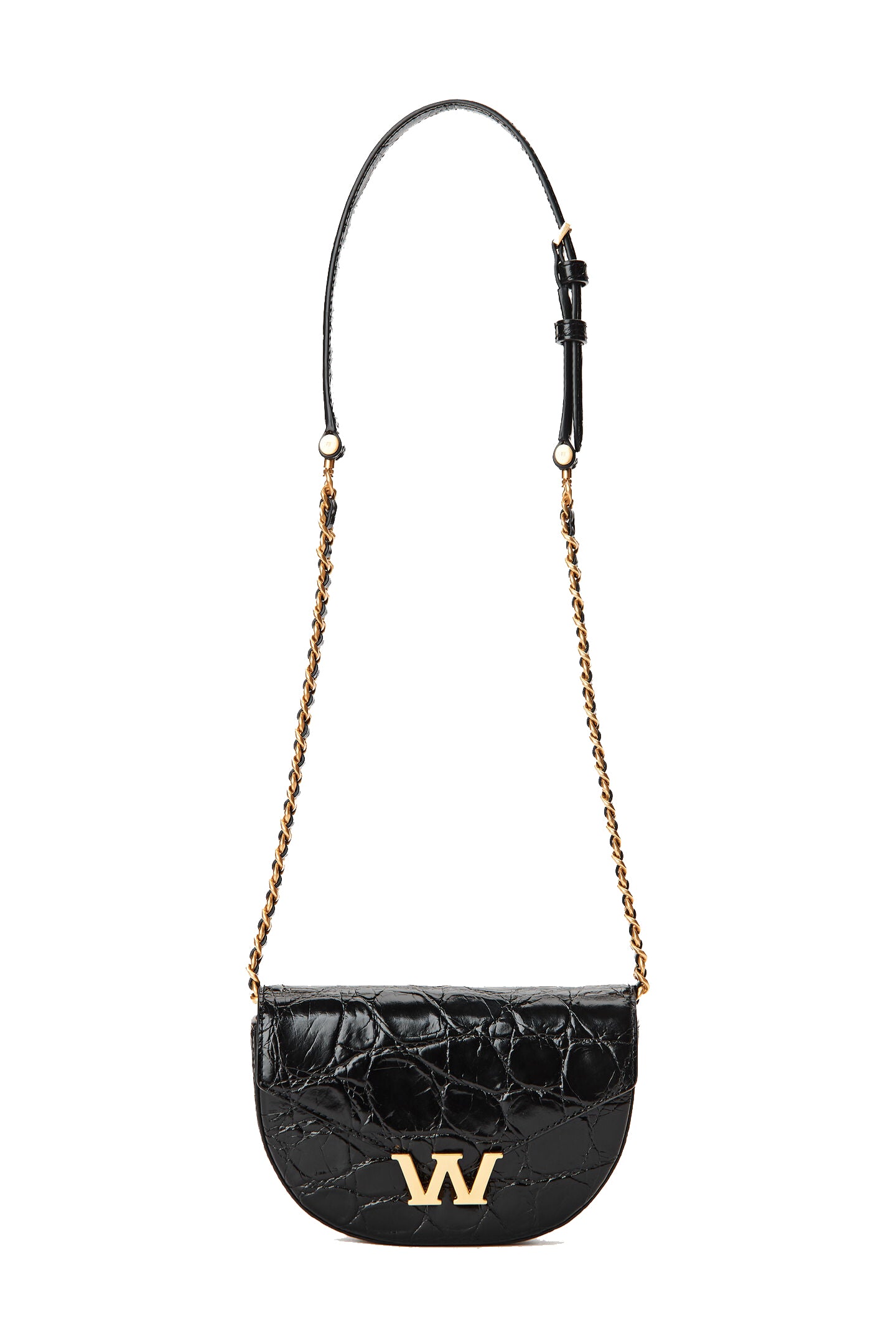 Small, half-moon shaped crossbody bag with chain-and-leather woven strap and signature "w" snap closure reinterpreted in shiny crocodile embossed leather