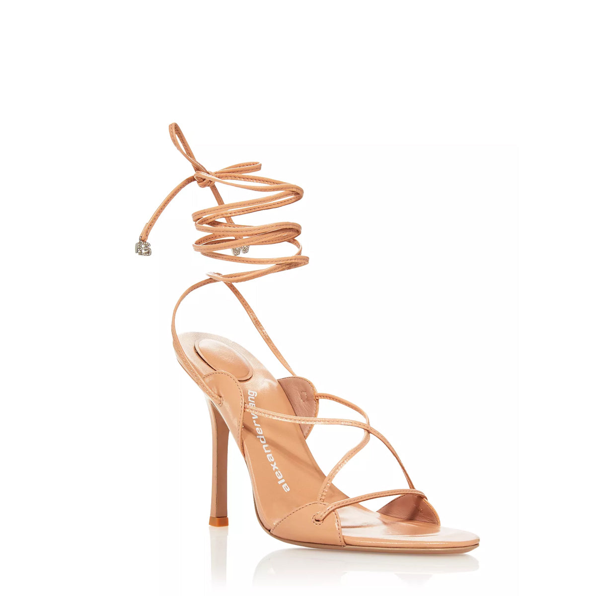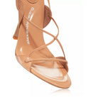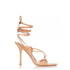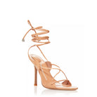 High heel sandal with delicate leather upper and ankle wrap ties with "a" and "w" diamante charms in peachy nude capretto
