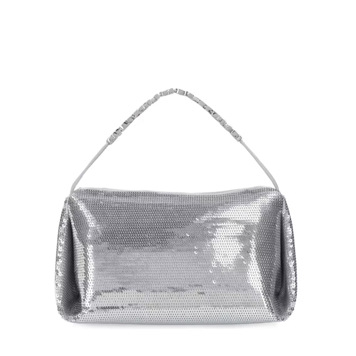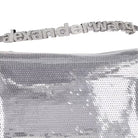 A micro sized hobo bag in silver sequined satin featuring a seamless body, diamante embellished logo charm and top handle. Metal zip closure, with twill lining.