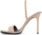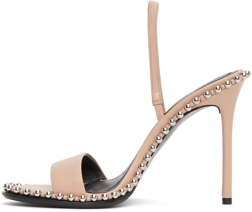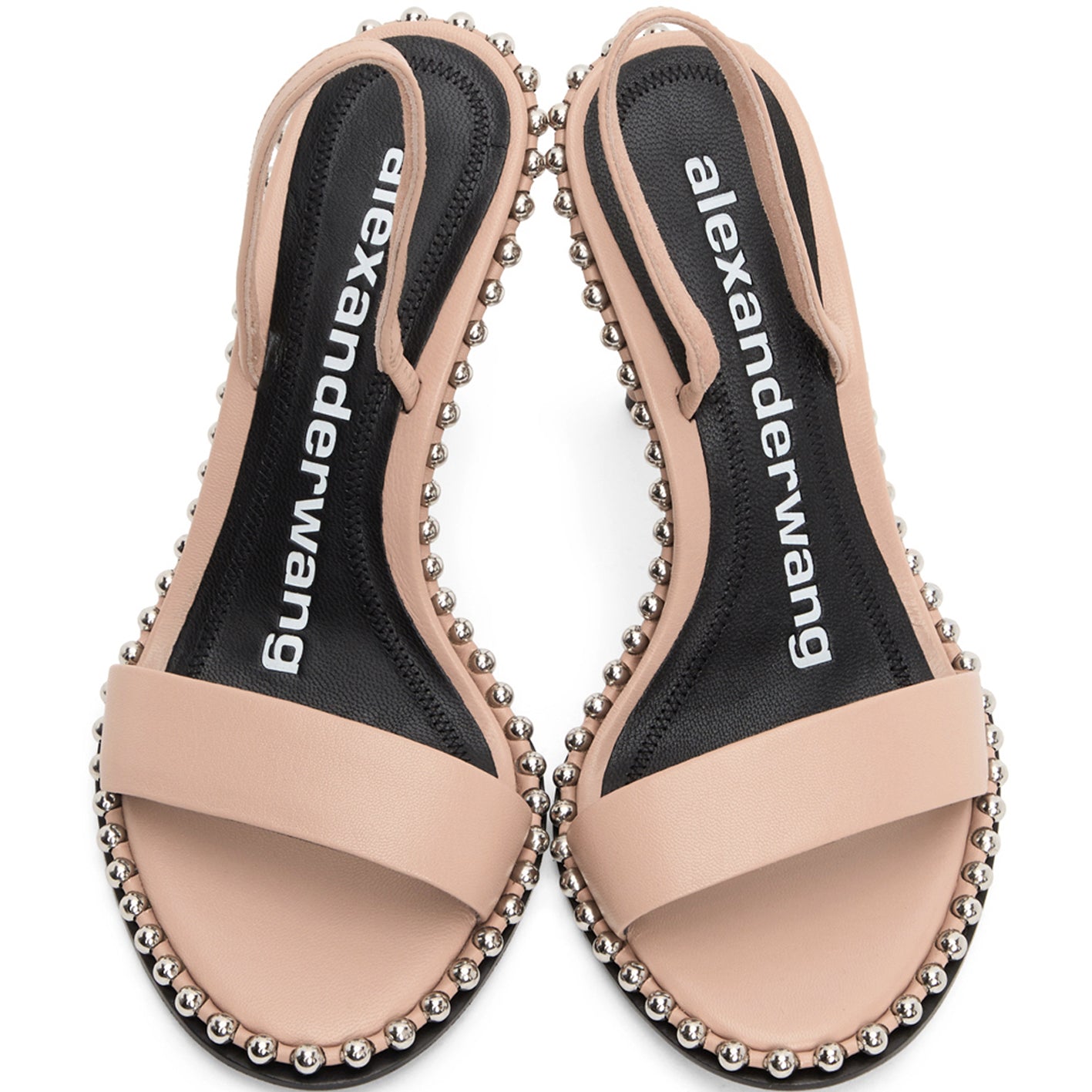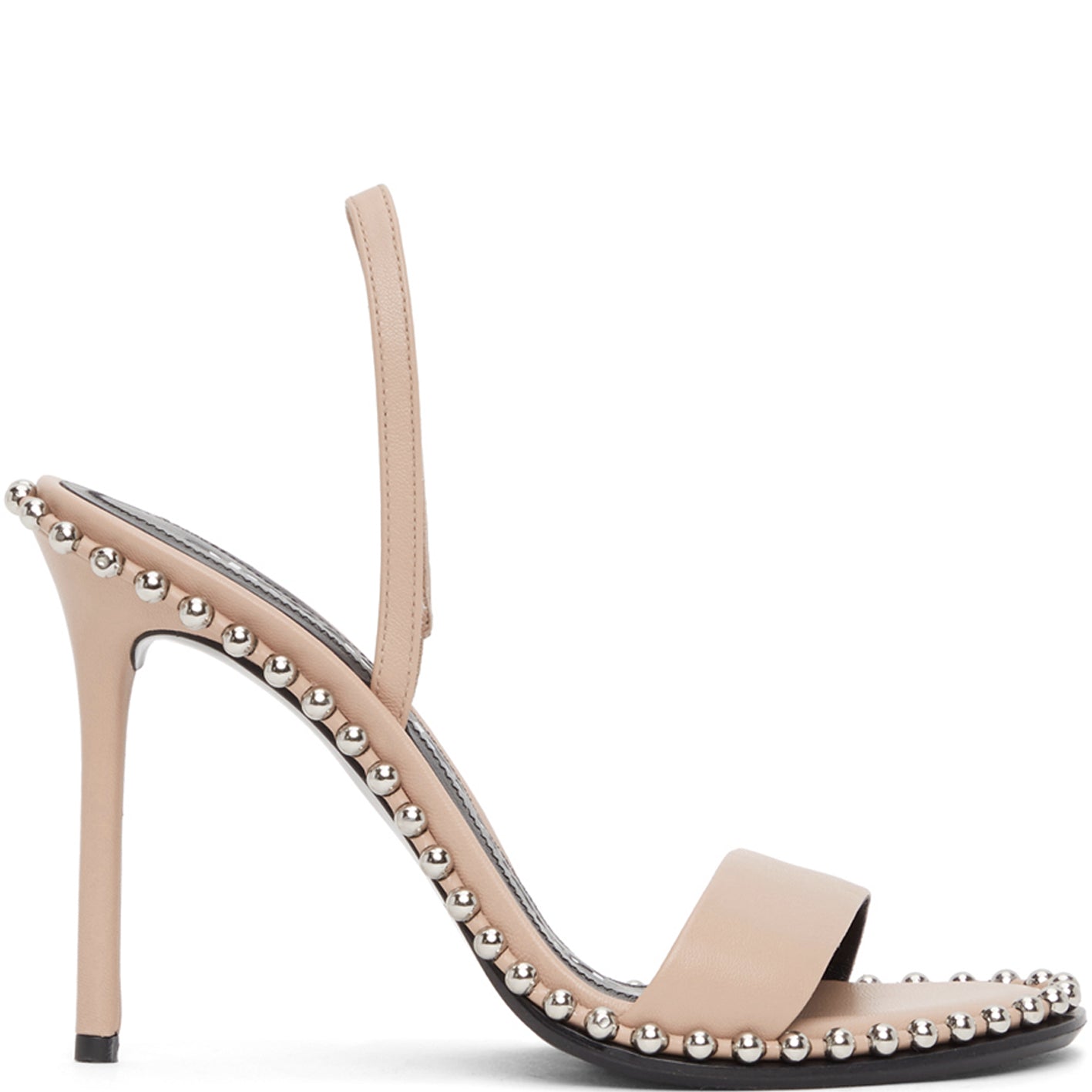 Nova high heel slingback sandal with metal ball chain trim around sole edge. Leather logo covered elastic back strap and clear front strap. Wrapped leather heel and leather outsole. True to size.