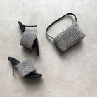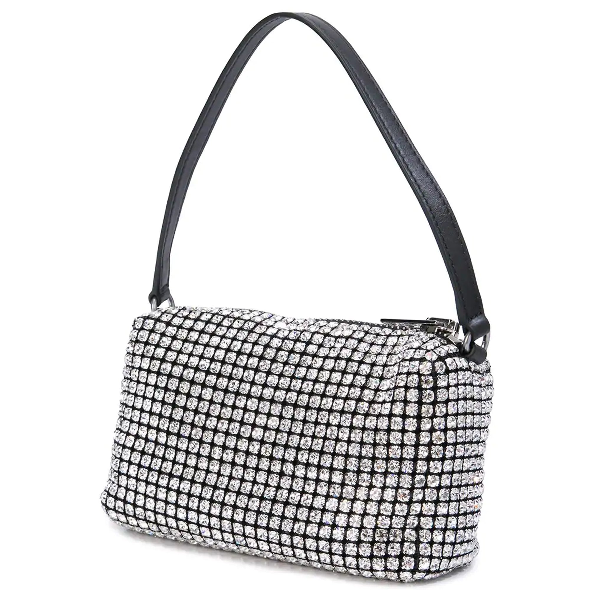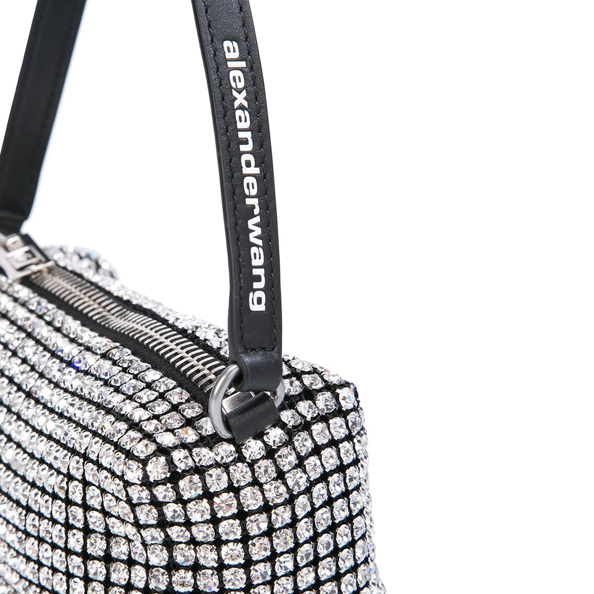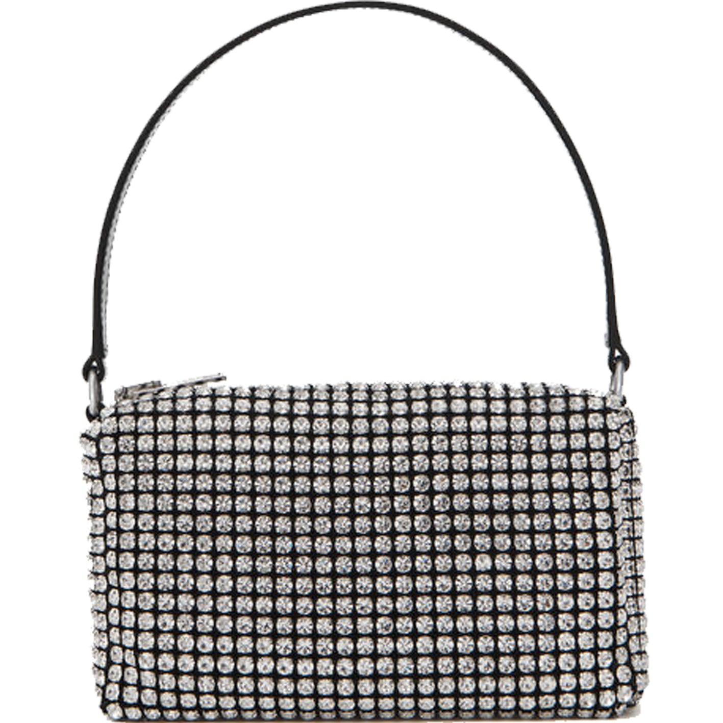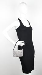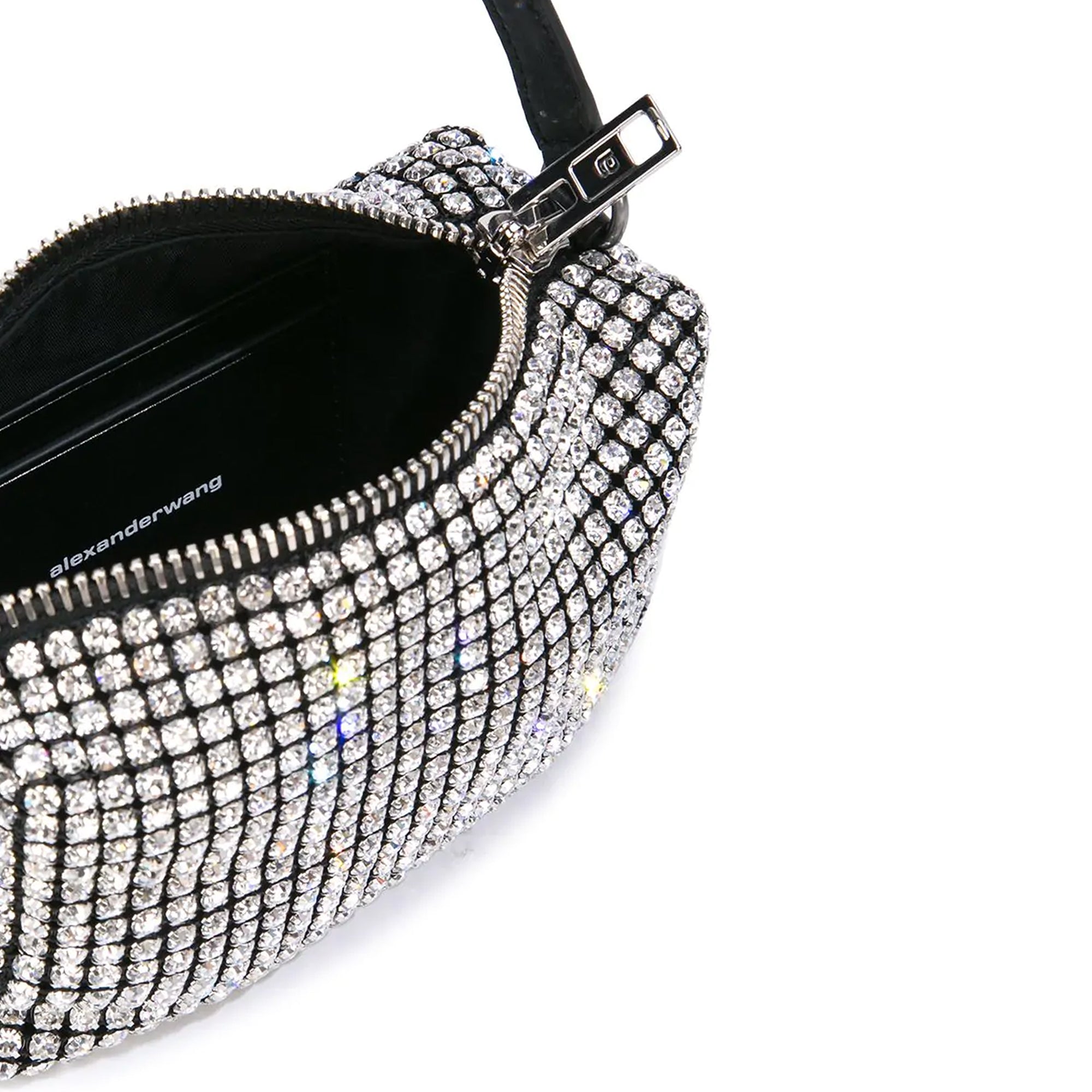This medium pouch features crystal glass rhinestone embellishments and a statement zipper. The interior lining is made from nylon with an interior card slots. The handle is imprinted with the logo.