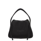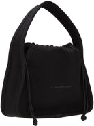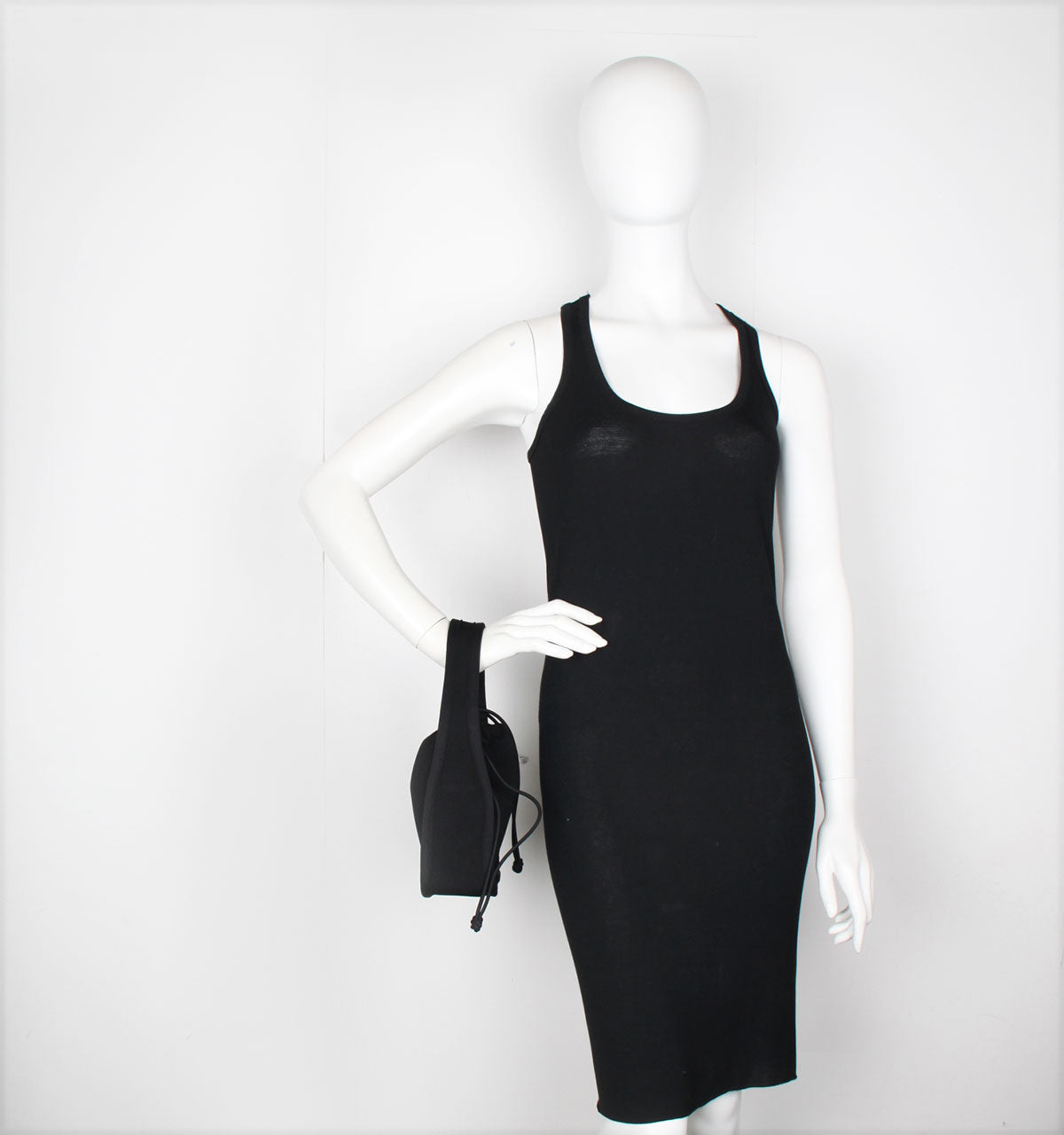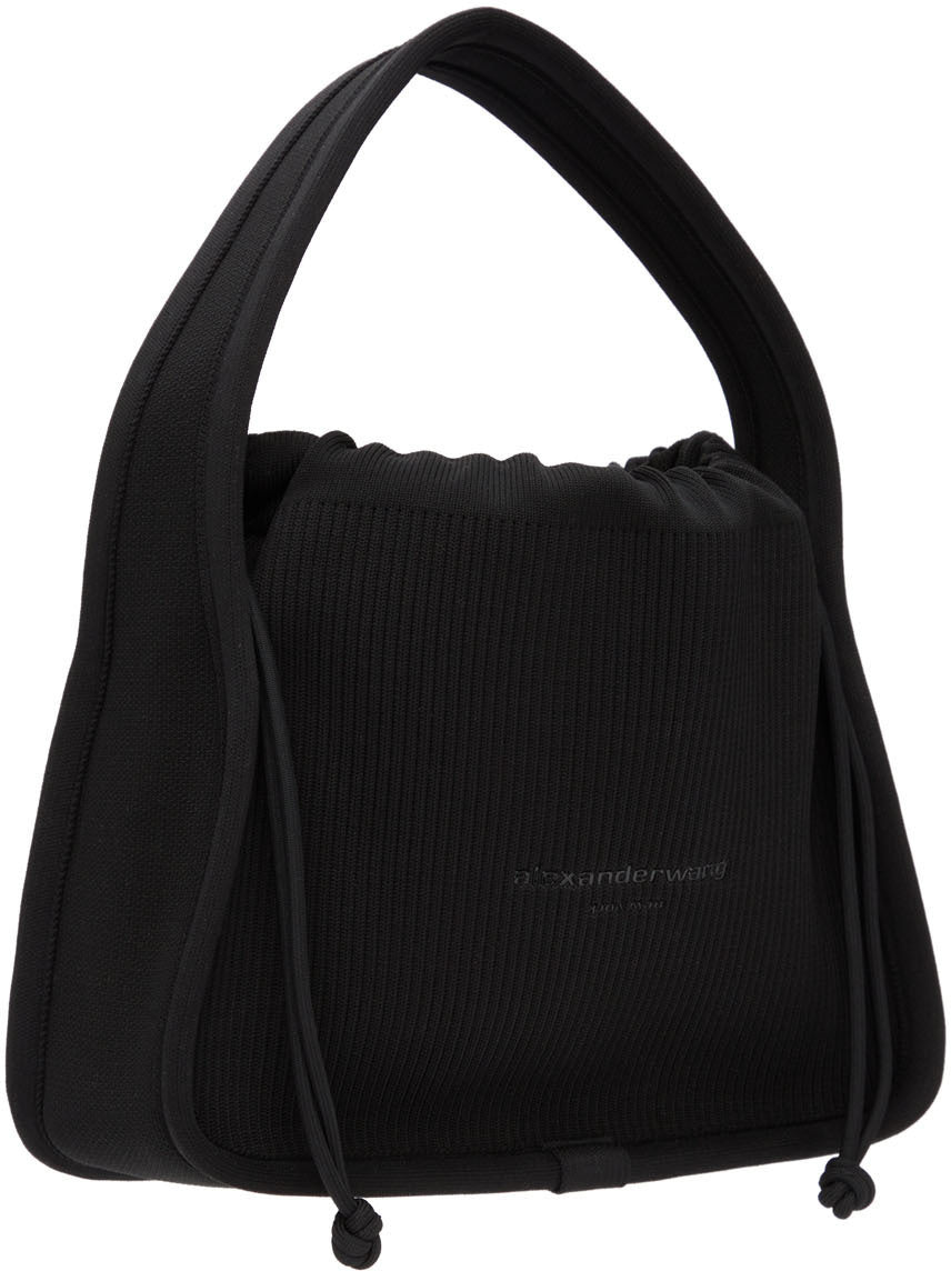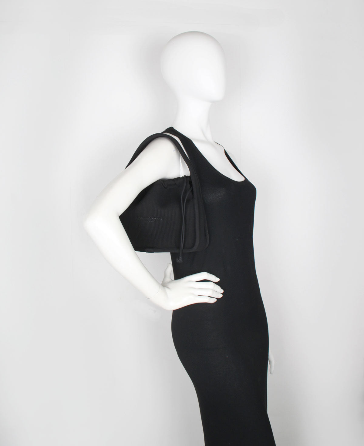 A black dust-bag inspired shoulder bag with a drawstring top closure and printed logo on front in ribbed nylon. One main interior compartment with three interior card slots and a structred shoulder strap.