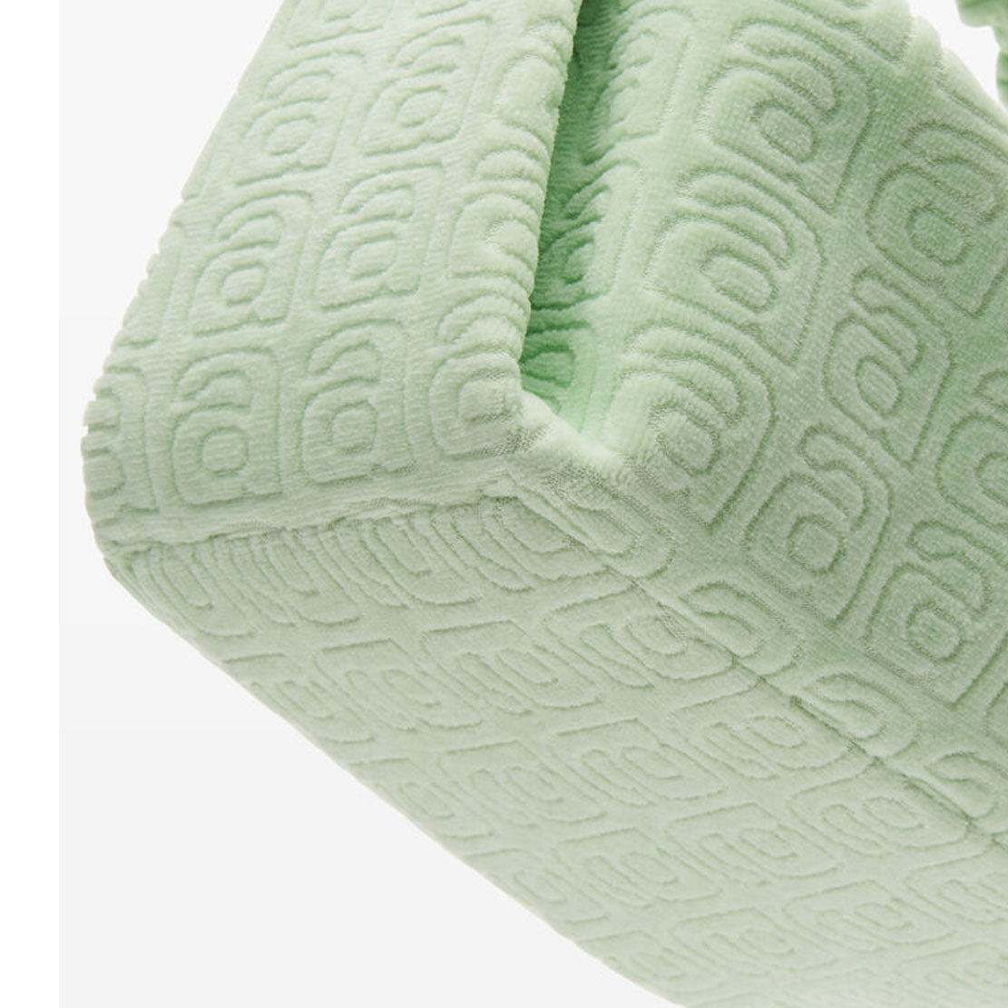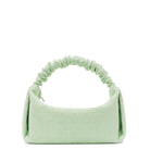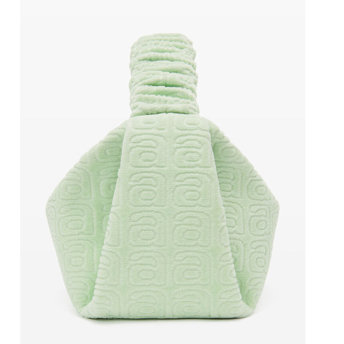 Mini bag with scrunchie-inspired top handle in simply taupe jacquard logo velour.