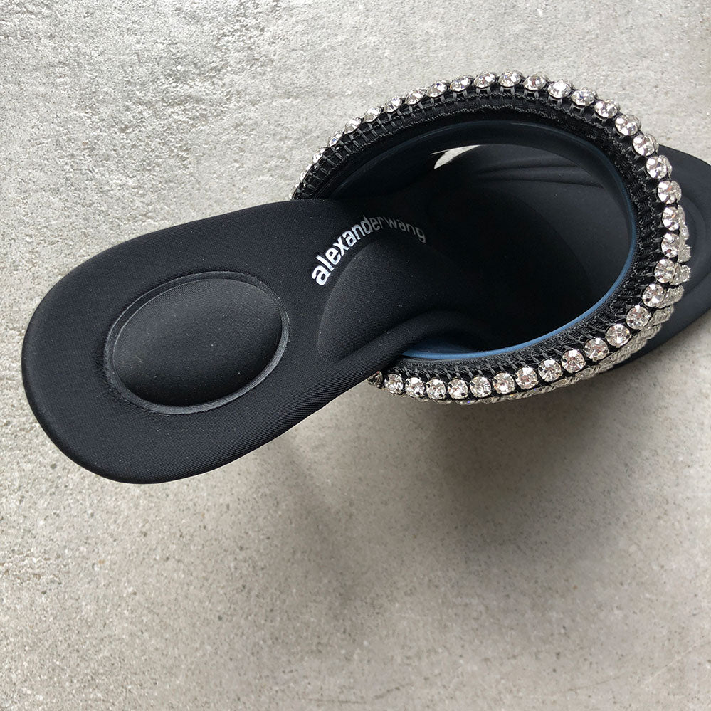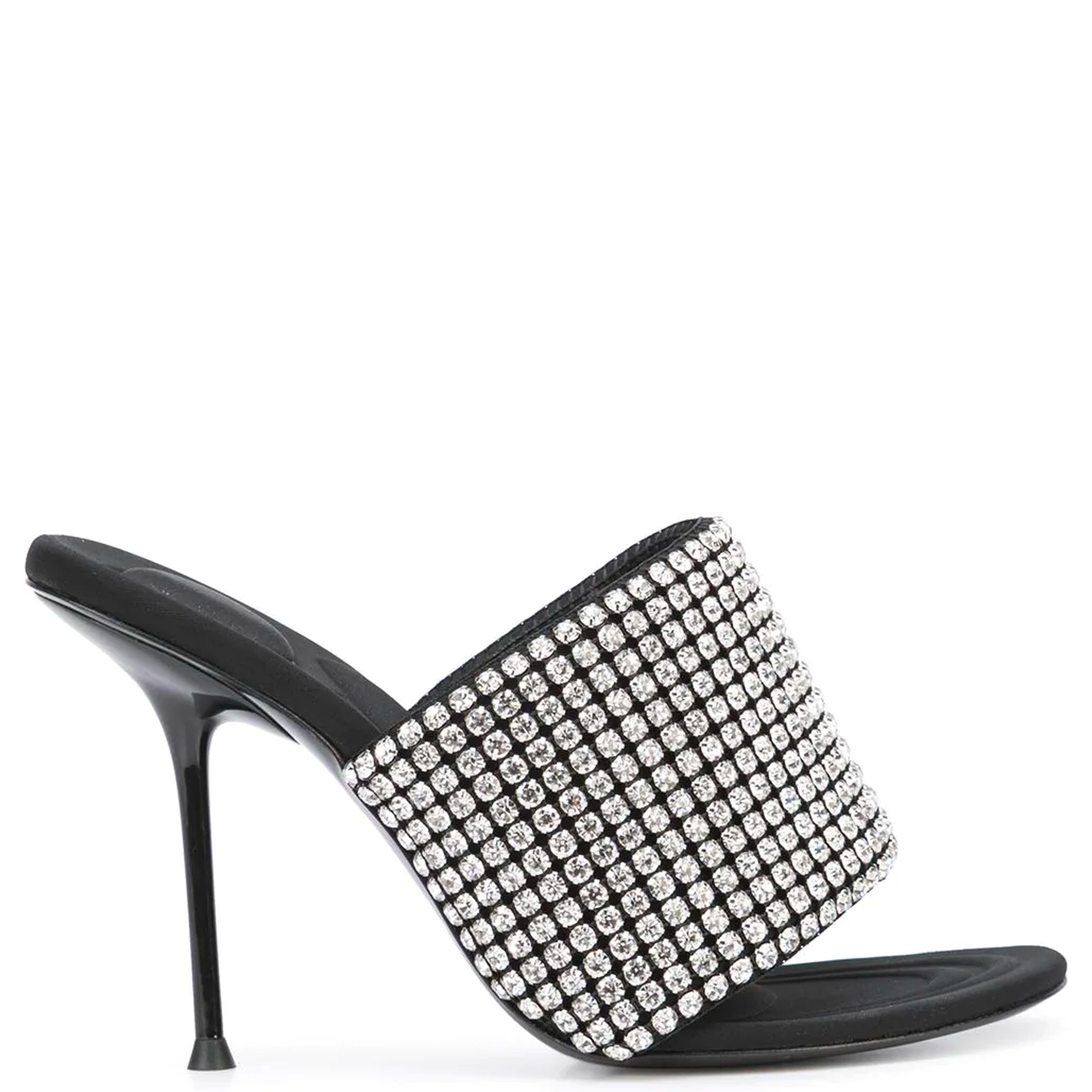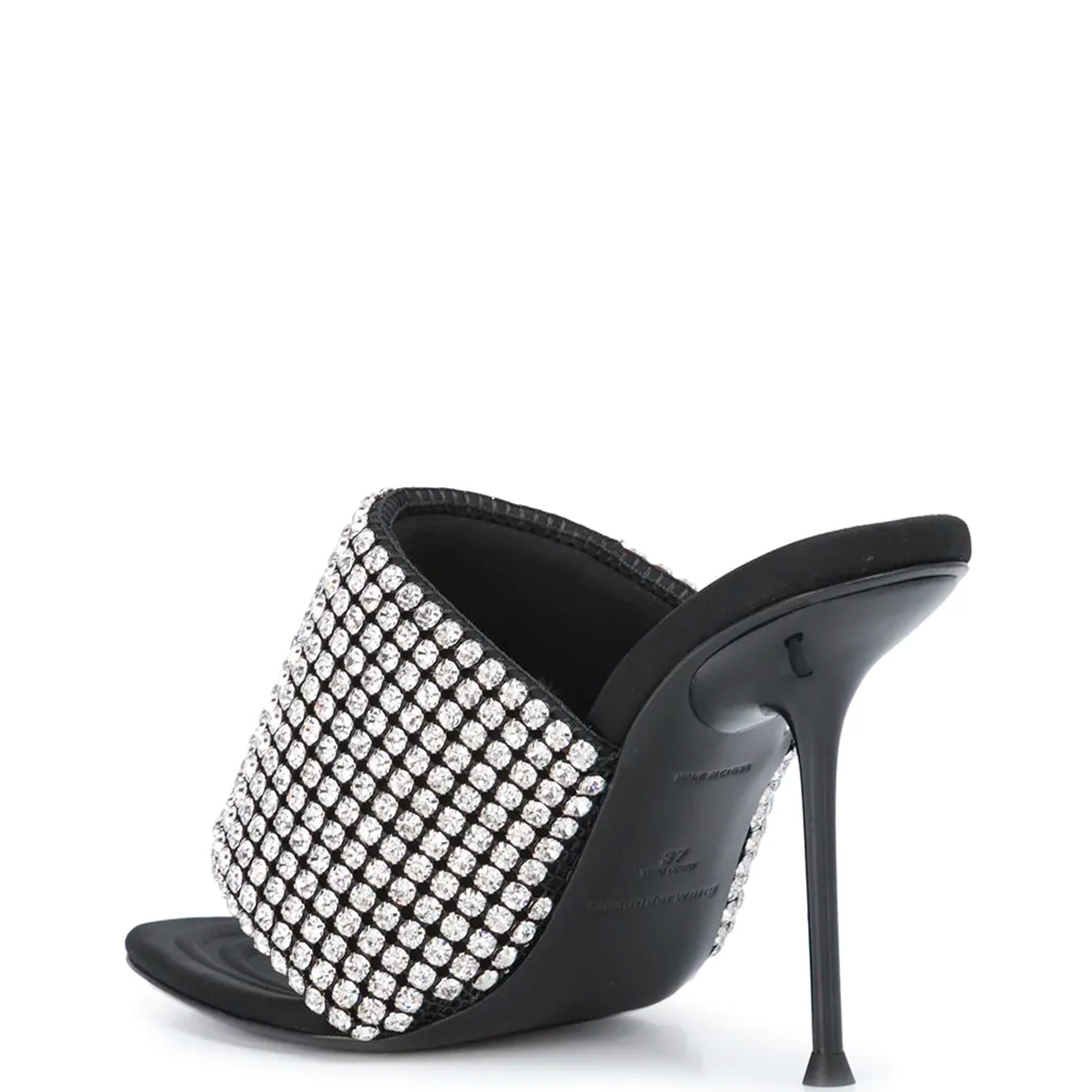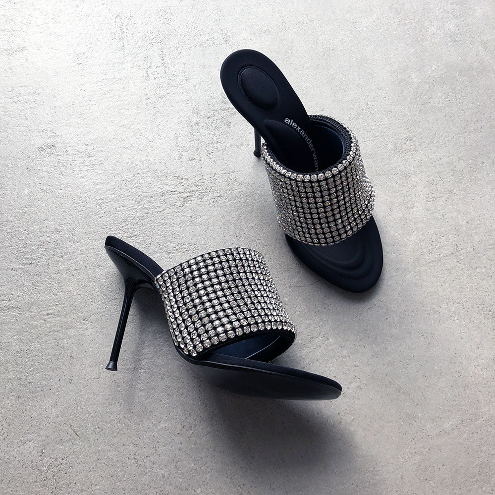 Sienna Crystal open-toe slide sandals with crystal rhinestone embellished upper strap. Moulded comfort foot-bed, almond toe and flared enamel stiletto heel. True to size, Dust bag included.