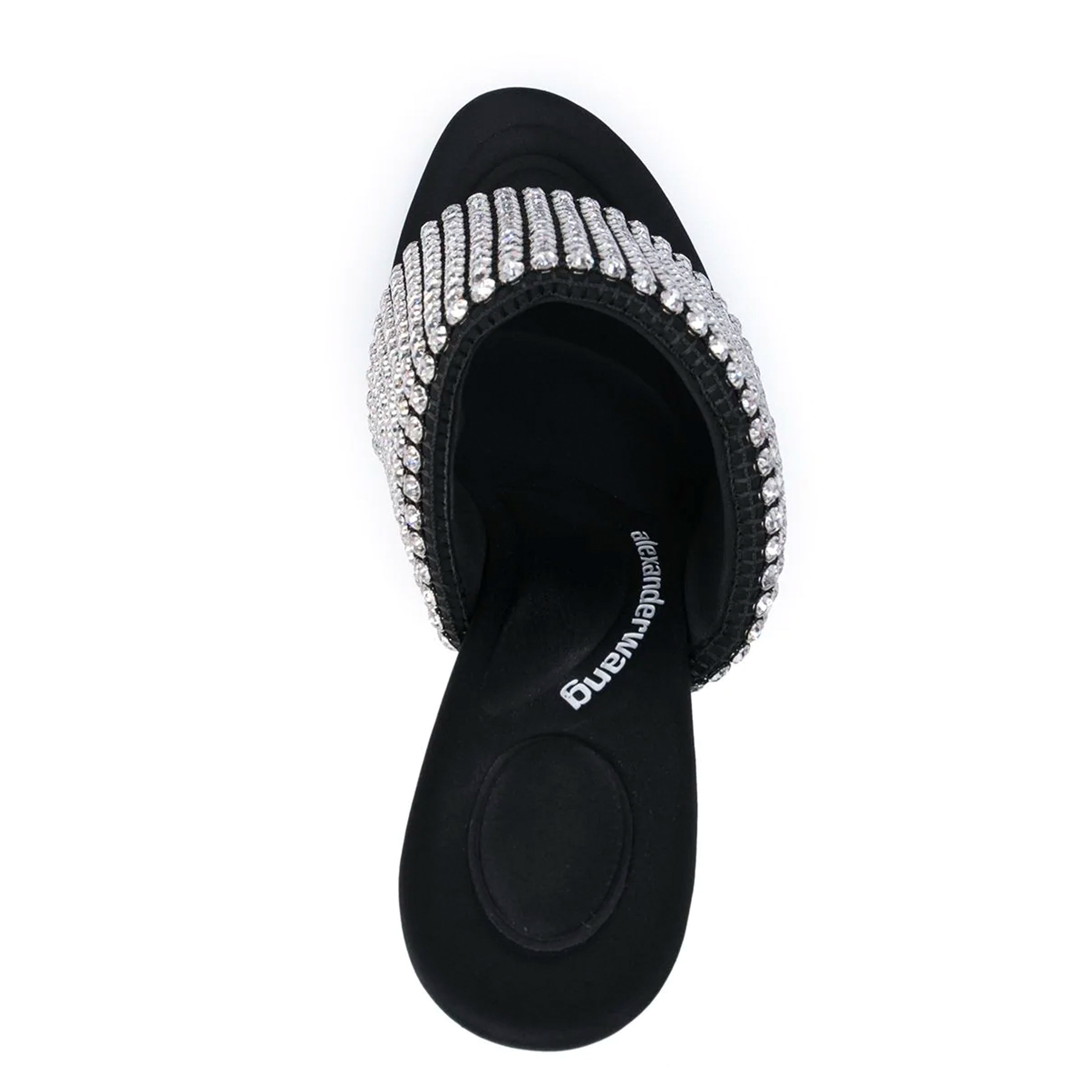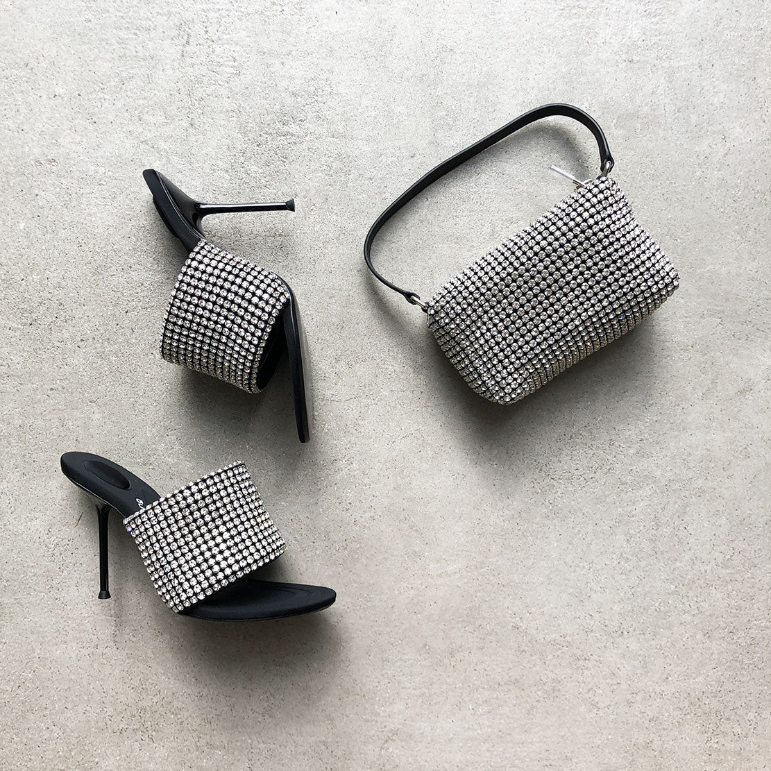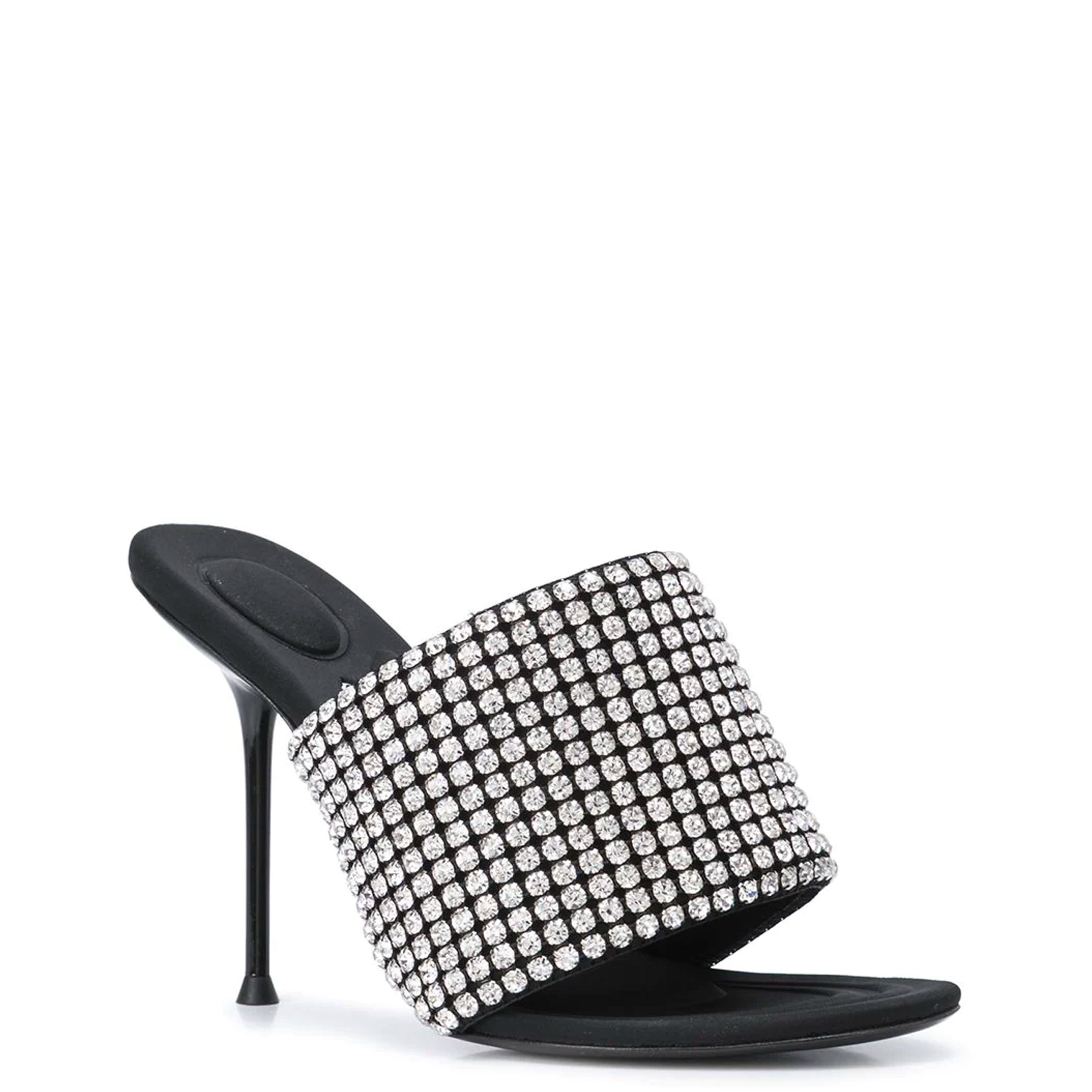 Sienna Crystal open-toe slide sandals with crystal rhinestone embellished upper strap. Moulded comfort foot-bed, almond toe and flared enamel stiletto heel. True to size, Dust bag included.