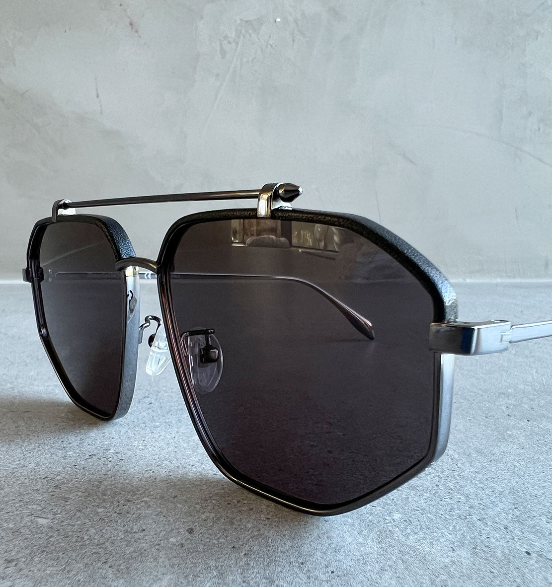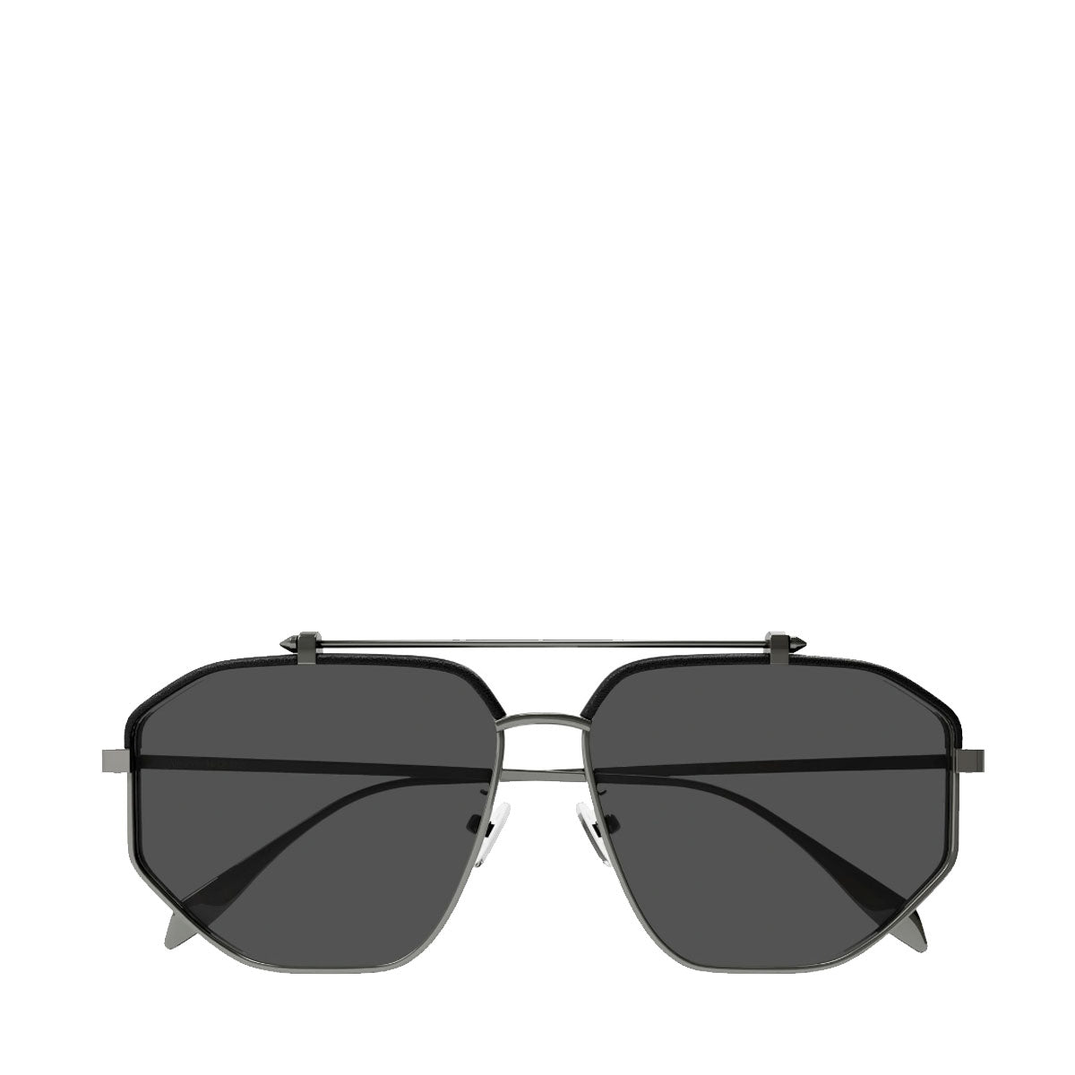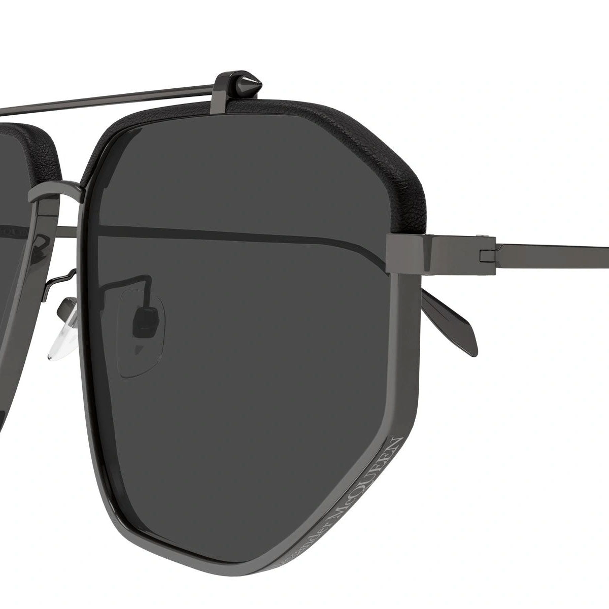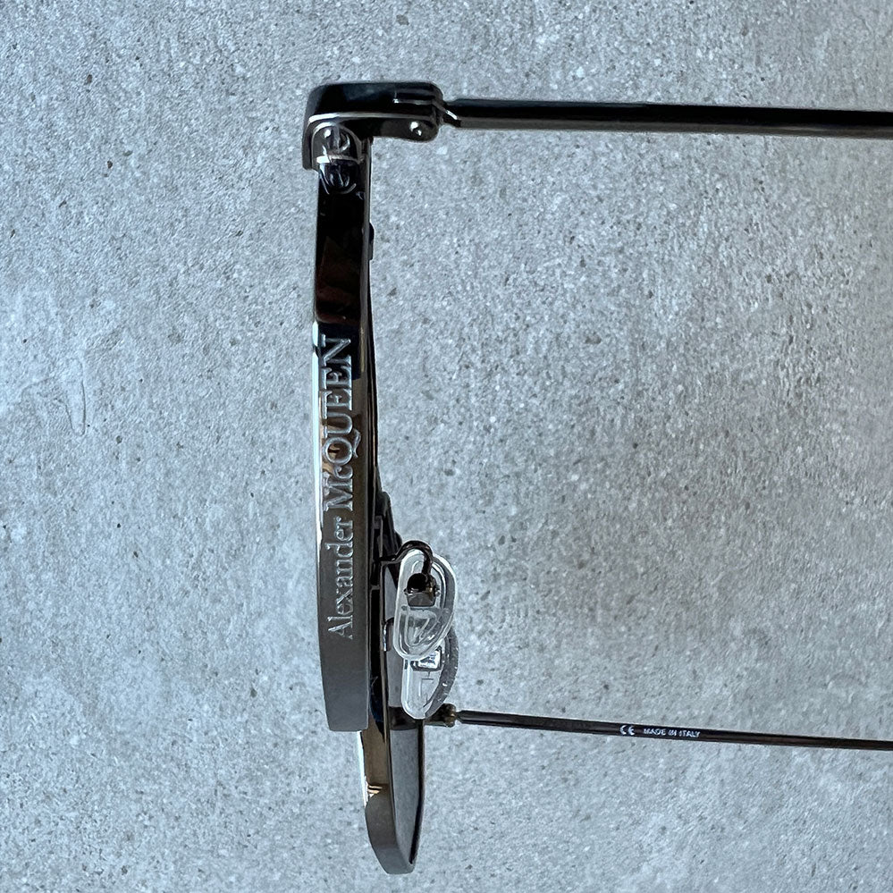 Unisex geometrical navigator shape in metal, enriched with the iconic piercing top bar on the front and the eyebrows covered with leather. The Alexander McQueen logo is lasered on the side of the metal rim.