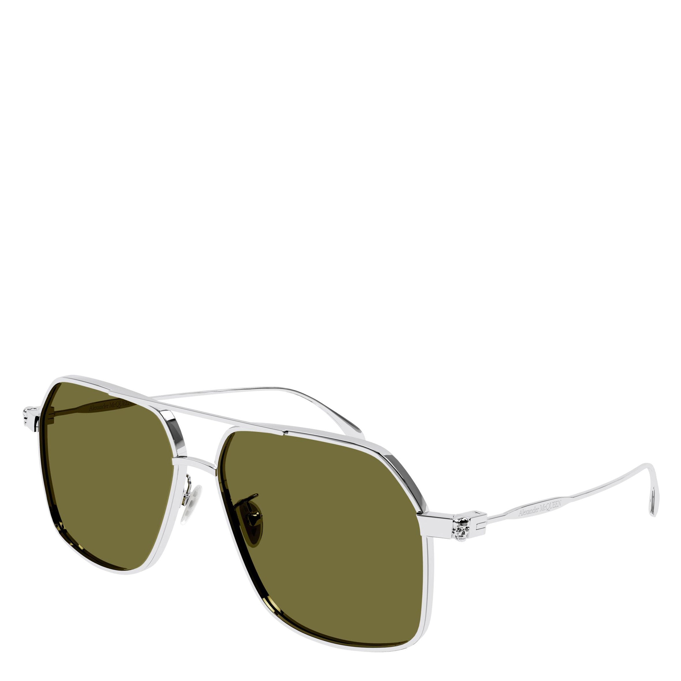 Shiny silver metal Caravan sunglasses fitted with military green lenses. The style features a 3D skull embedded in the end piece and a bone-like detail on the temples, which are finished with a lasered Alexander McQueen signature.