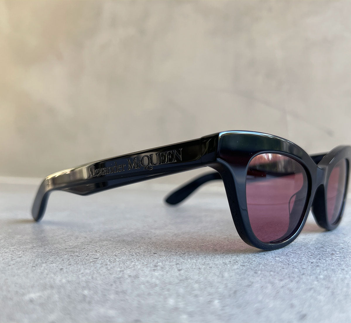 Shiny Black acetate sunglasses featuring a cat eye construction with pink lenses. Finished with a printed Alexander McQueen signature on the temples.