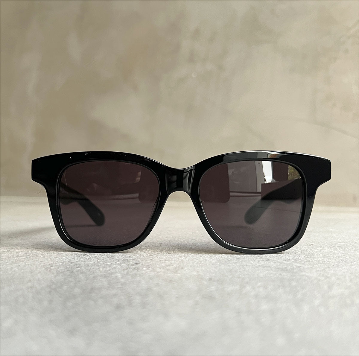 Shiny black acetate sunglasses featuring a squared construction with smoke lenses. Finished with a tonal Alexander McQueen logo on both temples.