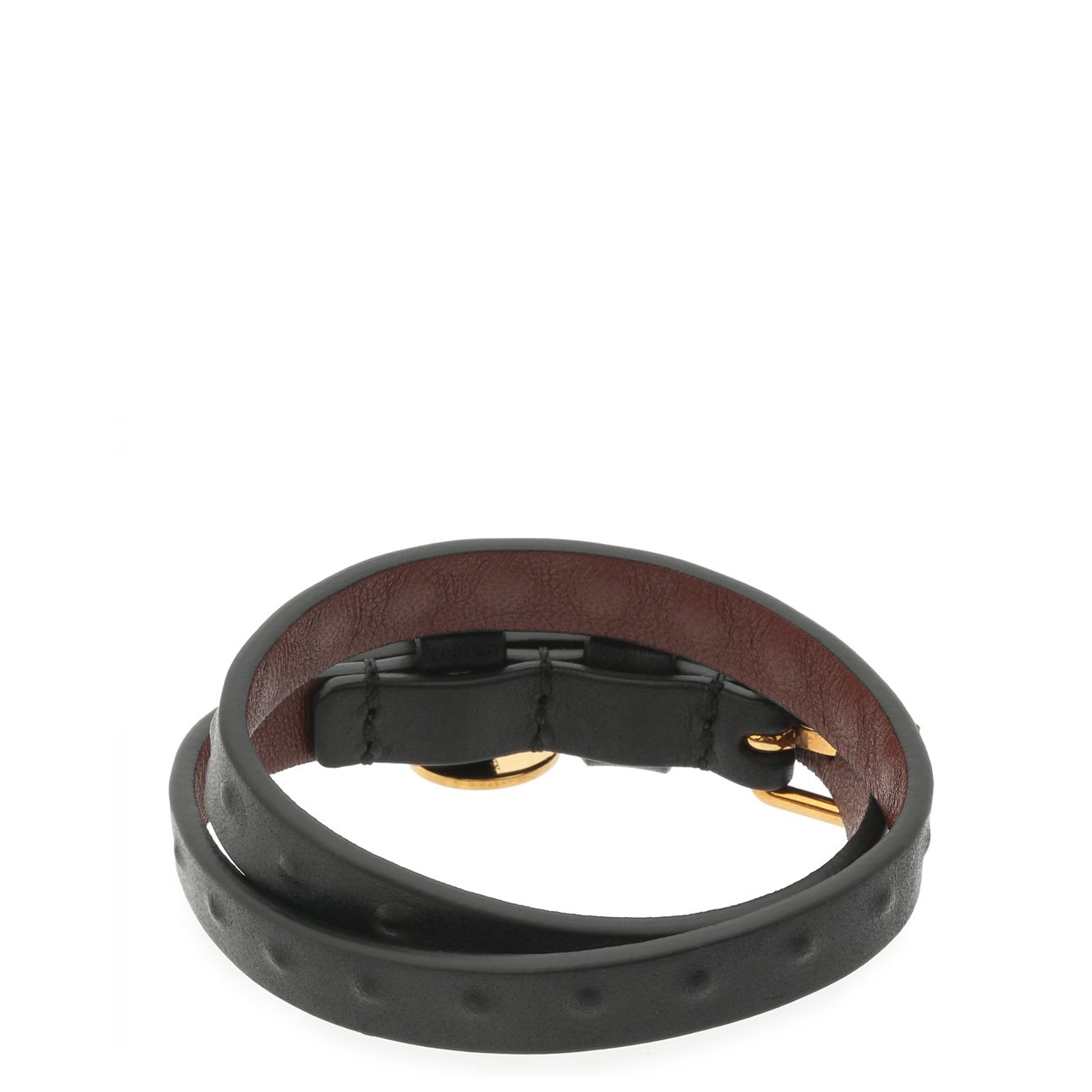 Adjustable double-wrap bracelet by Alexander McQueen in embedded stud-effect textured leather with the iconic Skull charm and engraved logo medal. Buckle closure, contrasting leather interior, gold-finish metal hardware.