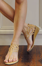 These Leather sandals have a distinctive cut-out pattern and gold metal studs centre-front. Signature wing-shaped buckle fastening at back. Nubuck leather in taupe colour with contrasting center in platinum tone.