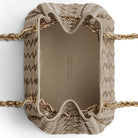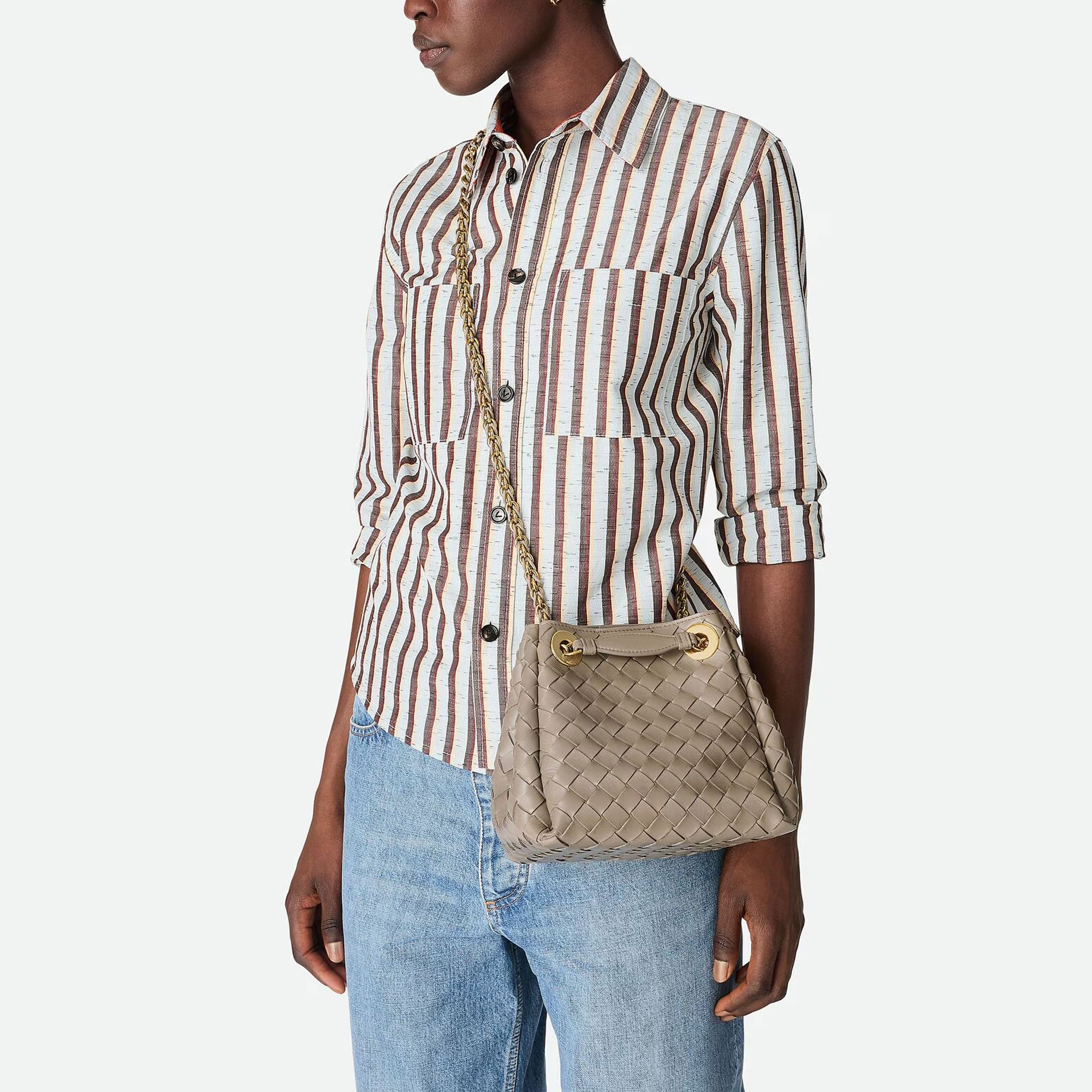 Andiamo is a new expression of the signature Intrecciato weave realised by the expert craftsmanship of artisans in the house’s atelier. Its name, Andiamo, “Let’s go” in Italian, embodies the spirit of the bag, a tribute to going places and the concept of craft in motion. The bag features a timeless Intrecciato silhouette woven by hand. A metal knot adorns and fastens its sliding braided chain, allowing it to be adjusted over the shoulder or across the body, giving the bag a soft tapered volume.