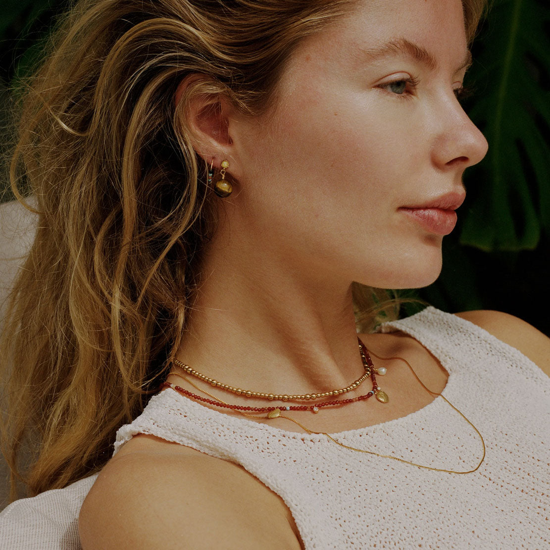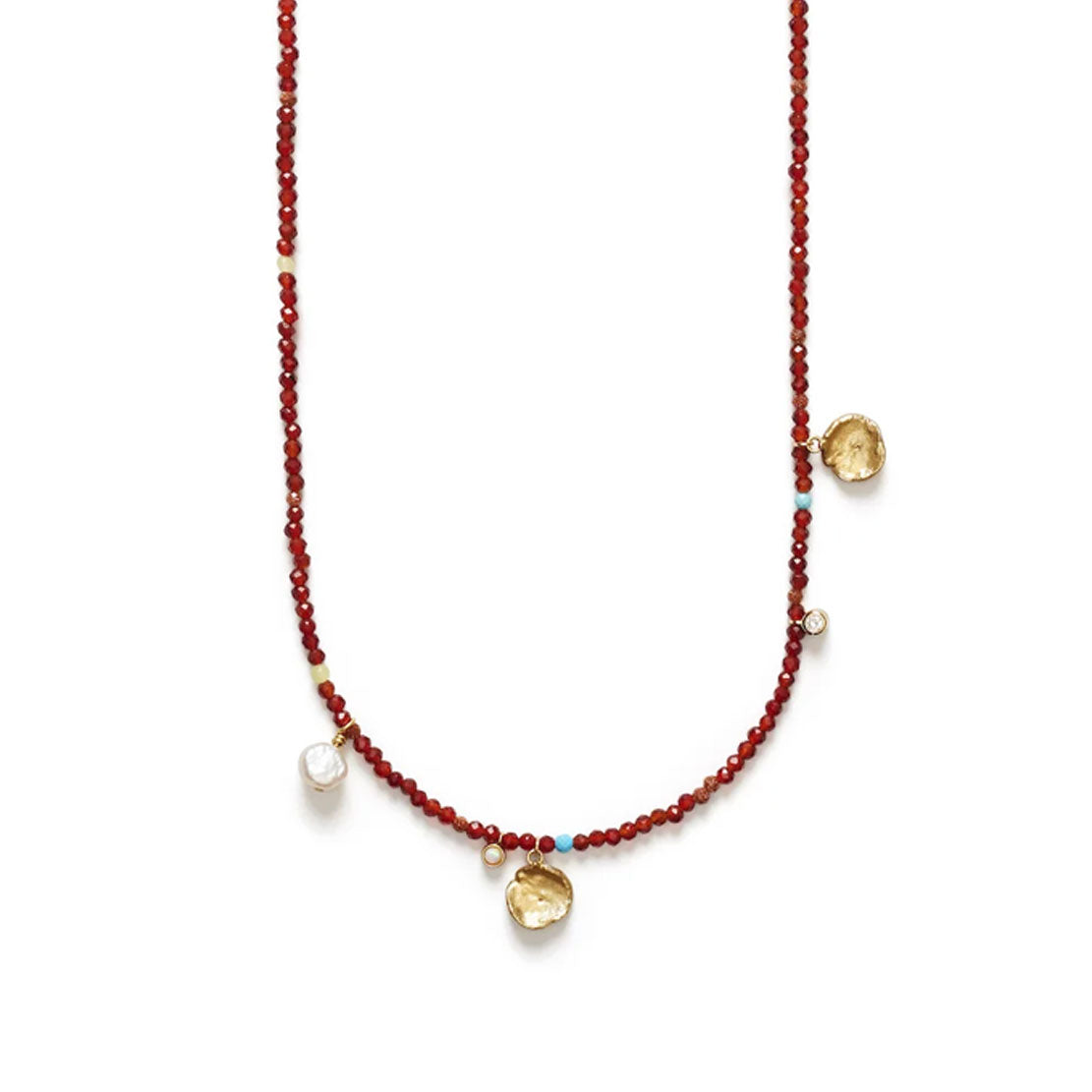 Infuse your style with a touch of boho chic with the Maroon Harmony Necklace. This enchanting piece channels the free-spirited vibes of the 70s, featuring precious gemstones, delicate charms, and freshwater pearls.