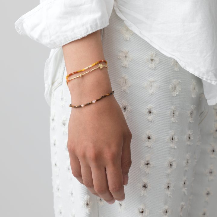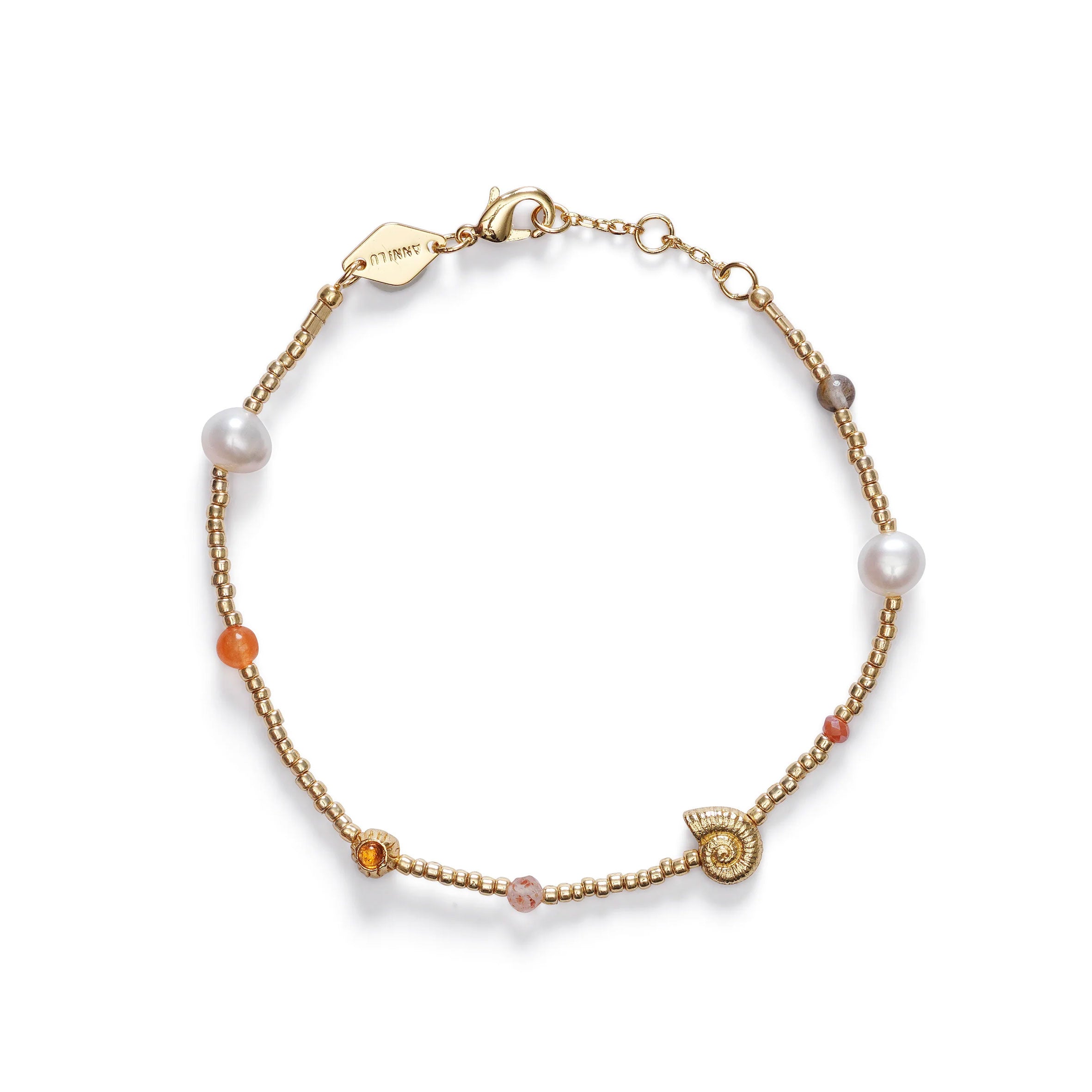 The delicate shell and the elegant pearls make this a true understated piece. Crafted with detailed glass beads, Orange Jade bead, Tiger Eye bead, Citrine cabochon, Imitation Opal Cabochon and cultured freshwater rice pearl.
