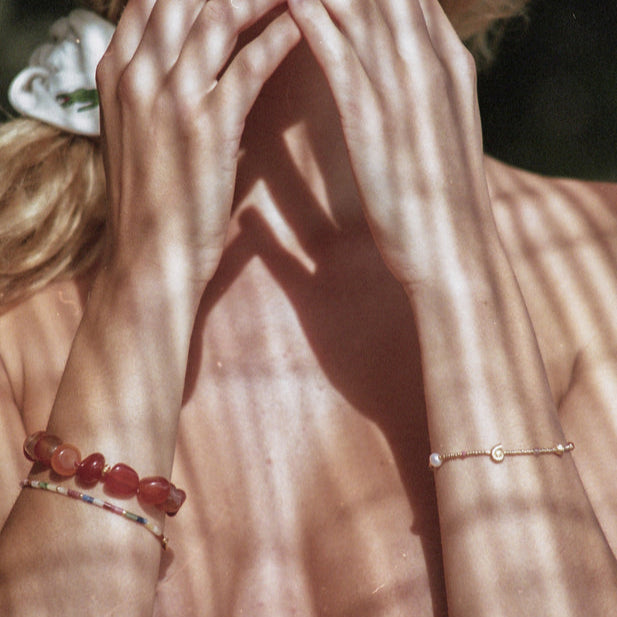 The gold combinations are plated with a thick layer of 18Kt gold - but kindly note that with time the plating will be worn off. This is normal and not a reason for a claim. We highly recommend to avoid lotion, hairspray and other cosmetics to be in contact with your jewelry. Please do not wear your jewelry while sleeping and doing sports. Please remember to avoid exposing your jewelry to water, salt, sun, chlorine and other chemicals - especially the designs with freshwater pearls. Please store your jewelry in a dry room jewelry box, never in the bathroom.