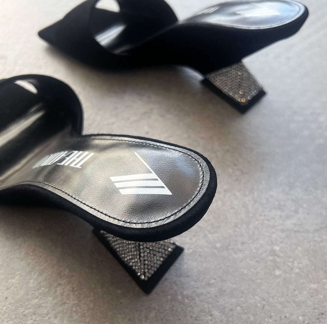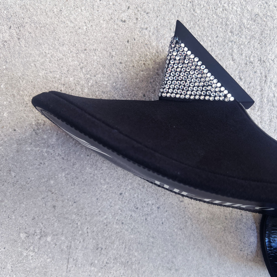 ''Cheope'' mule in black satin with crystal thermoadhesives rhinestones and pyramid wedge, height 60mm.