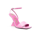 ''Cheope'' sandal in fuchsia satin with fluo fuchsia eco-friendly patent pyramid wedge, height 105mm.