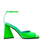 ''Piper'' sandal in neon emerald patent leather with pyramid heel, ankle strap and silver logo buckle, heel height 85mm