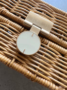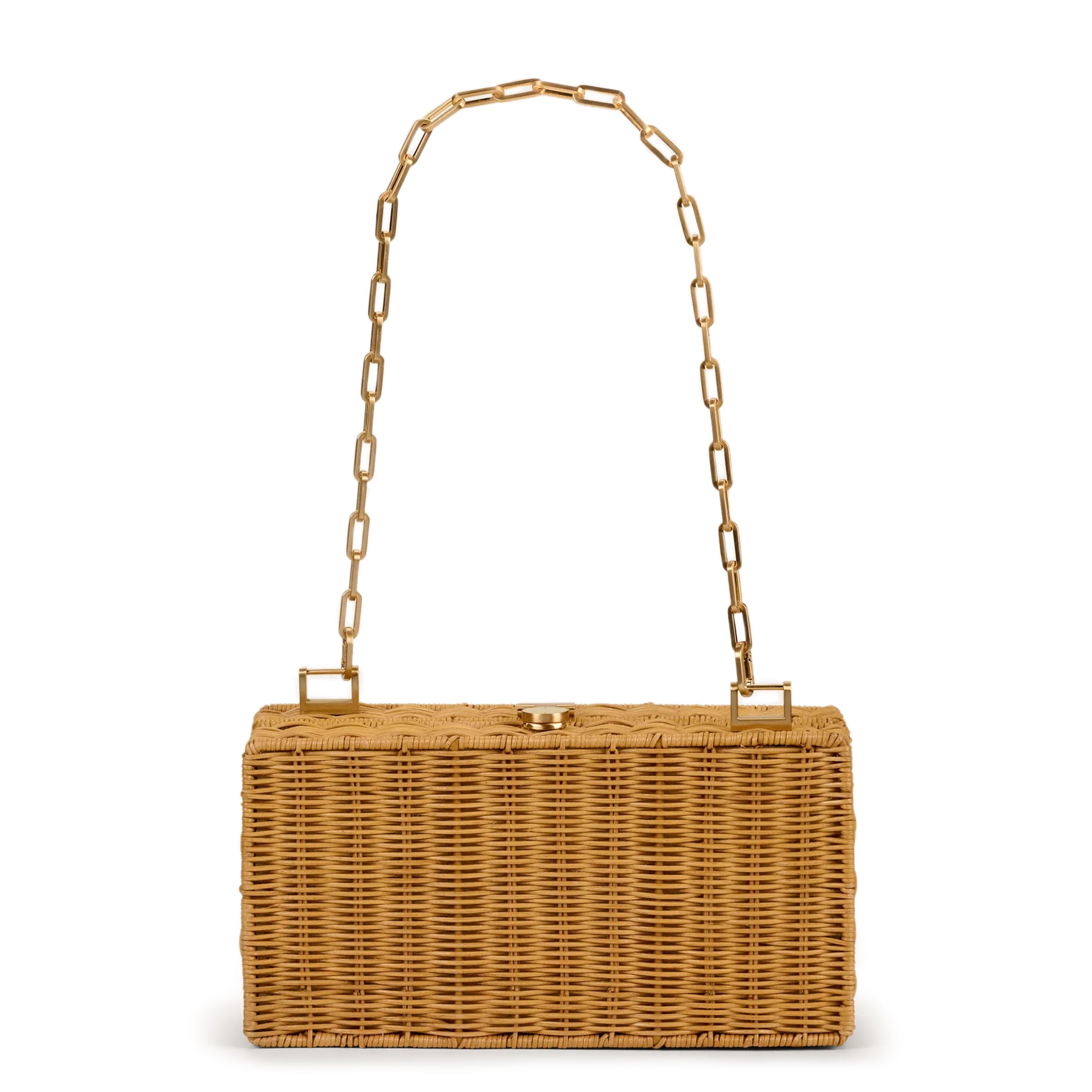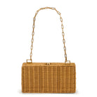 A whimsical rattan clutch that doubles as a portable game of backgammon when opened up.