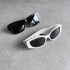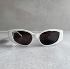 Balenciaga BB0258S sunglasses made with high density acetate frames, fitted with sleek grey lenses. Bold oval shape in glossy black acetate with white Balenciaga logo at temples.