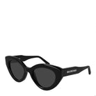 Balenciaga BB0073S Sun Oval Cat sunglasses designed with a cat eye frame. Angular arms feature rounded ends to create a comfortable fit, while a white lettered logo on the temple adds a distinctive luxury edge. Gray-tinted lenses and beveled edges.
