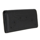 Balenciaga's Blackout money wallet is dot perforated in a motif of the house's signature hardware. Crafted in grained leather with zip-around closure. Leather zipper pull on coin pocket, 3 compartment gusseted interior and 12 card slots. Lined in black cotton canvas.