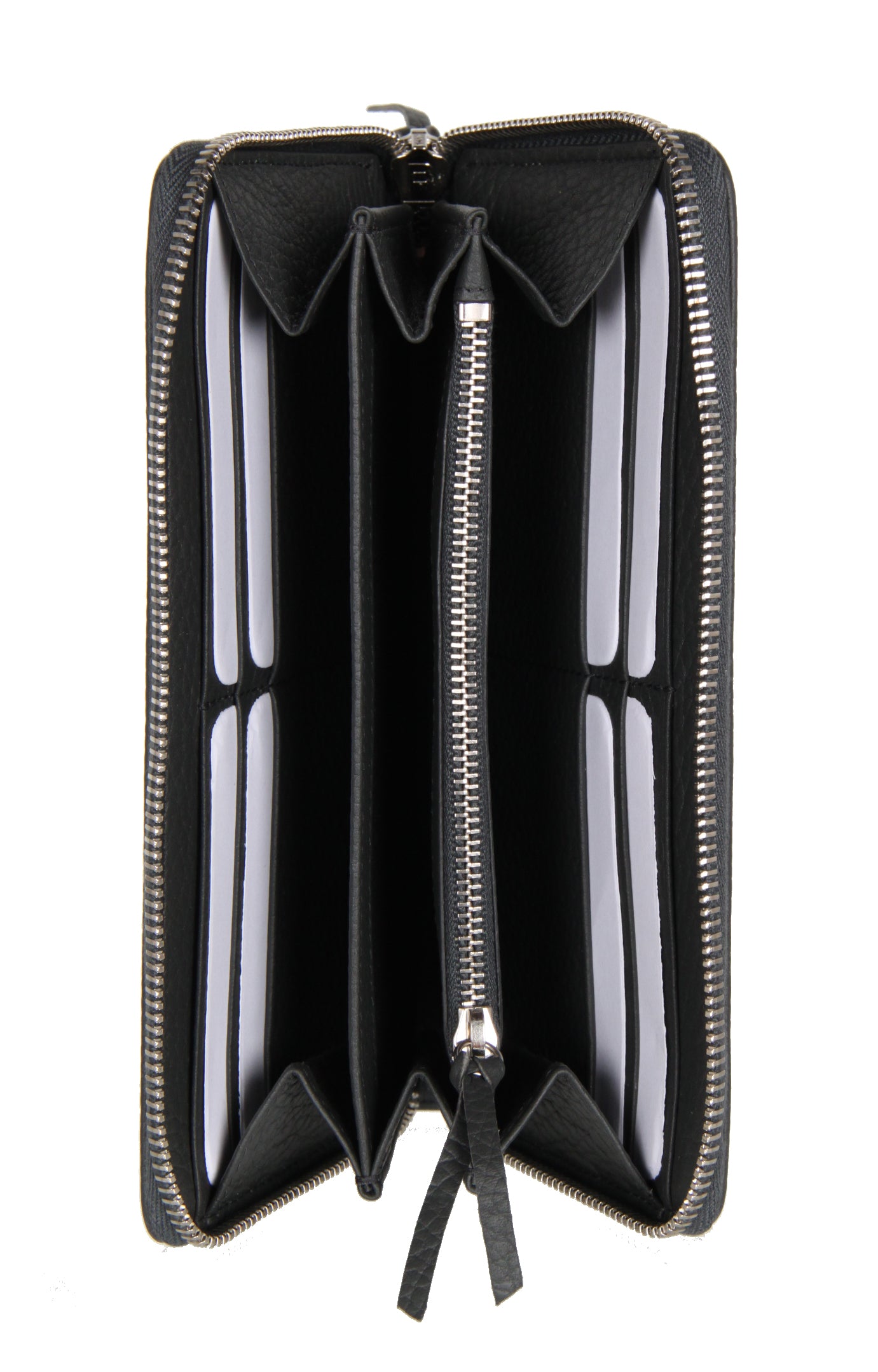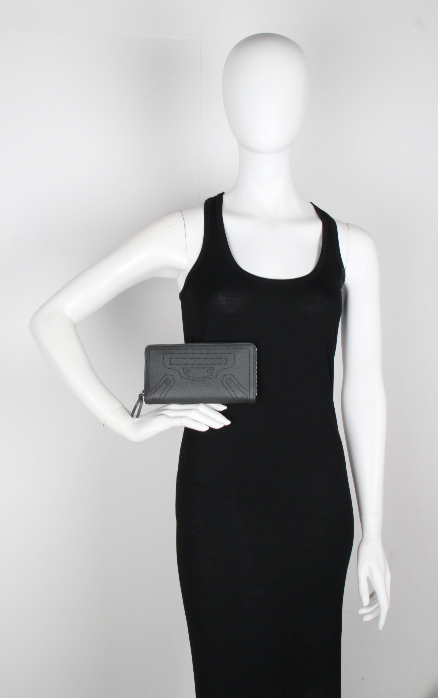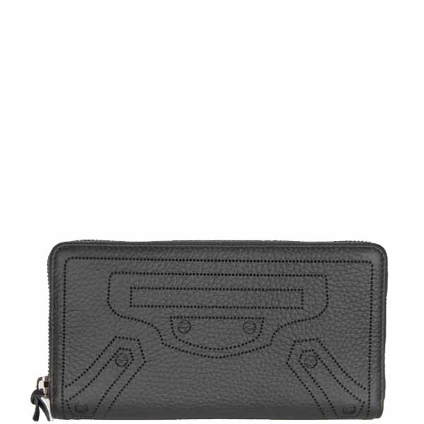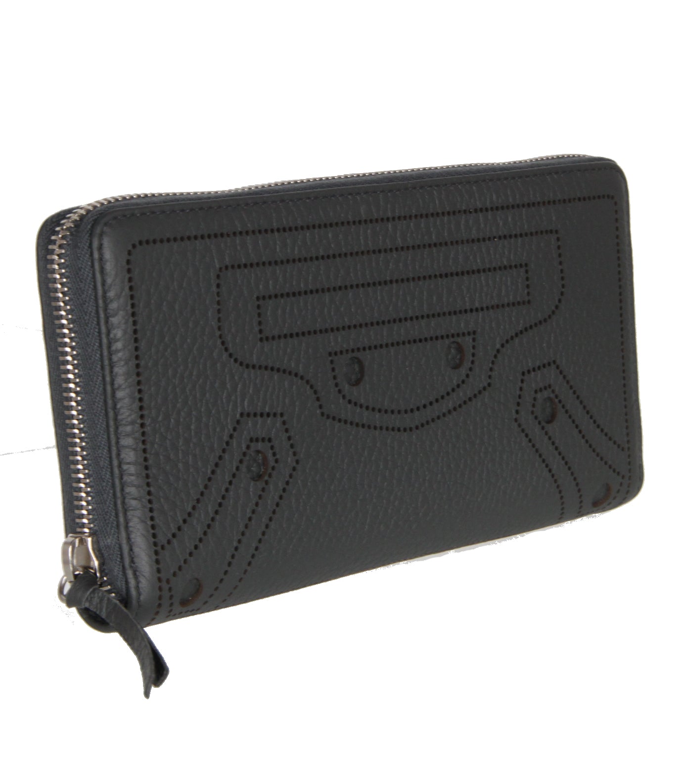 Balenciaga's Blackout continental zip wallet is dot perforated in a motif of the house's signature hardware. Crafted in grained leather with zip-around closure. Leather zipper pull on coin pocket, 3 compartment gusseted interior and 12 card slots. Lined in black cotton canvas.
