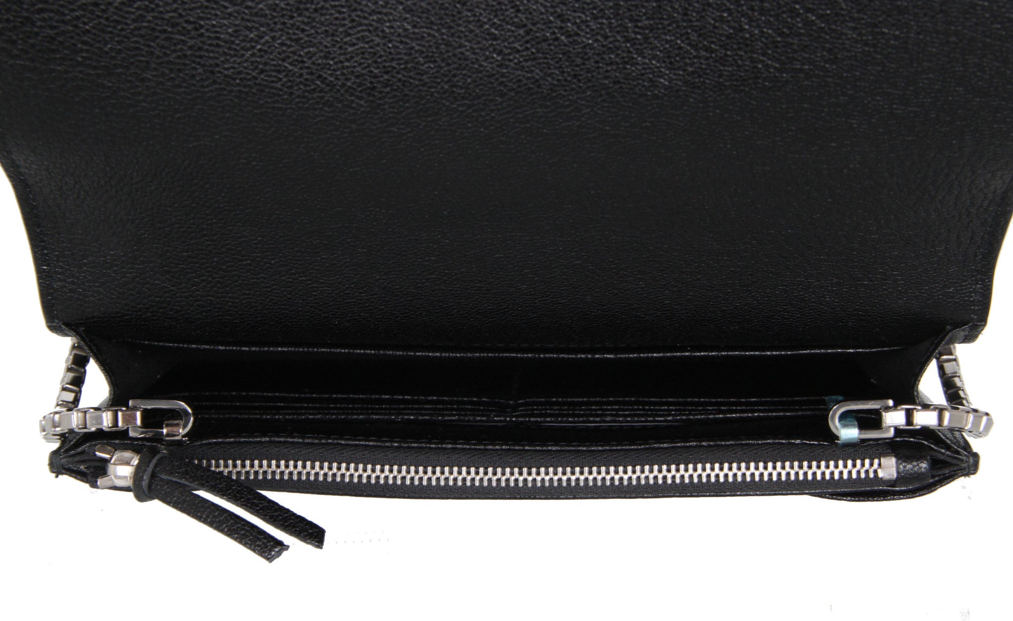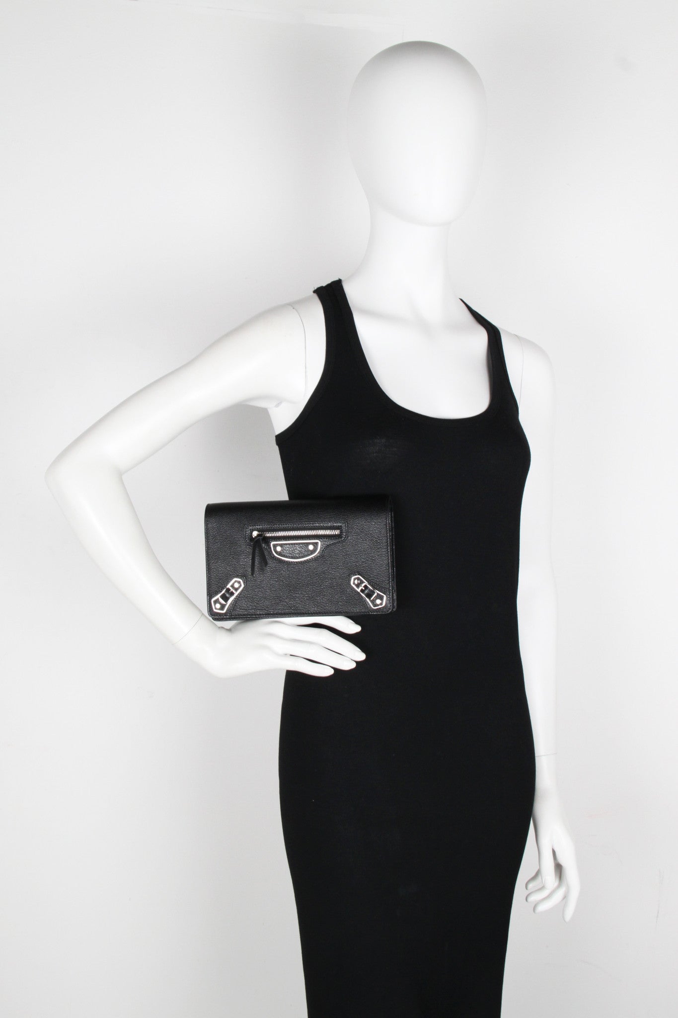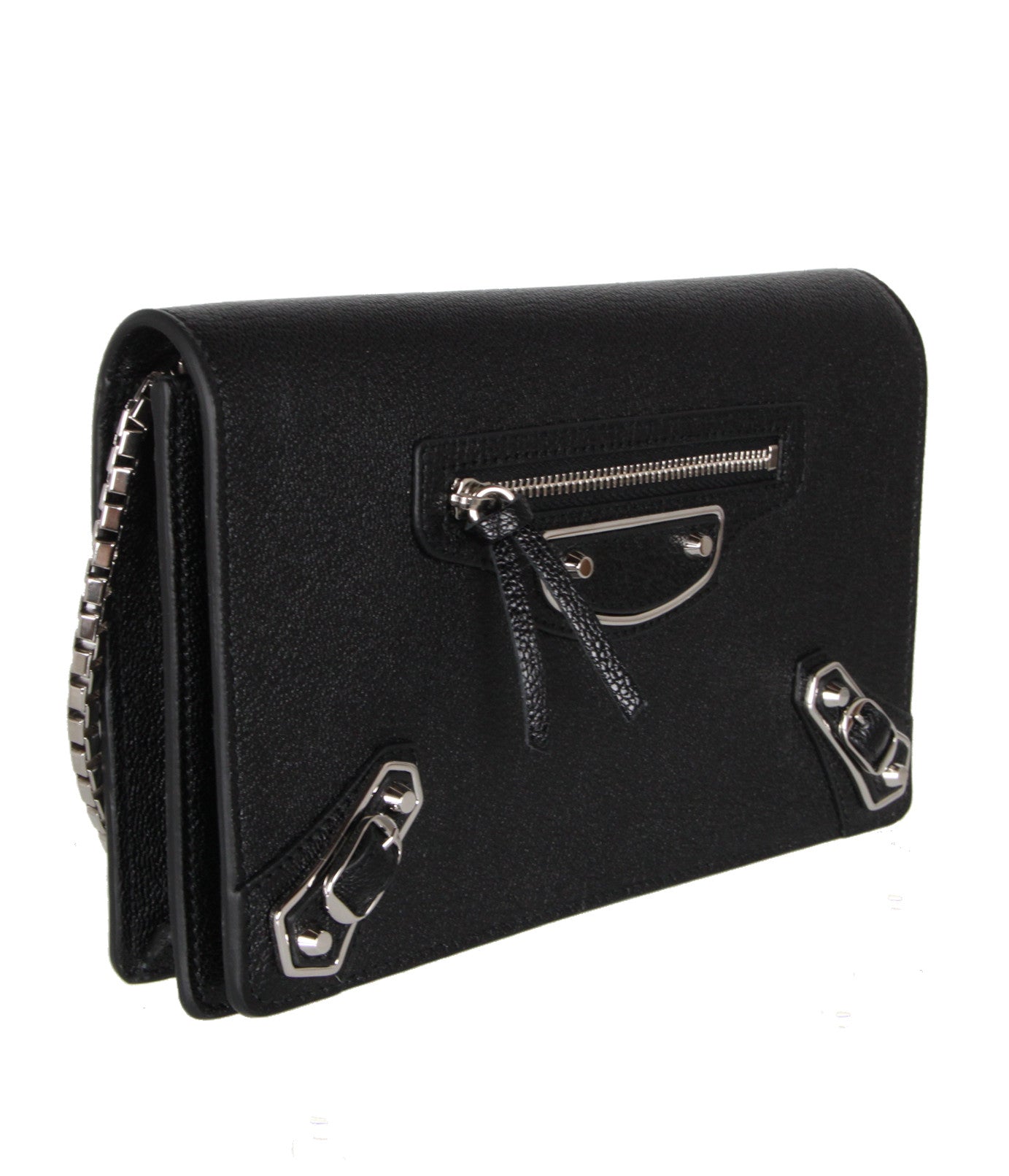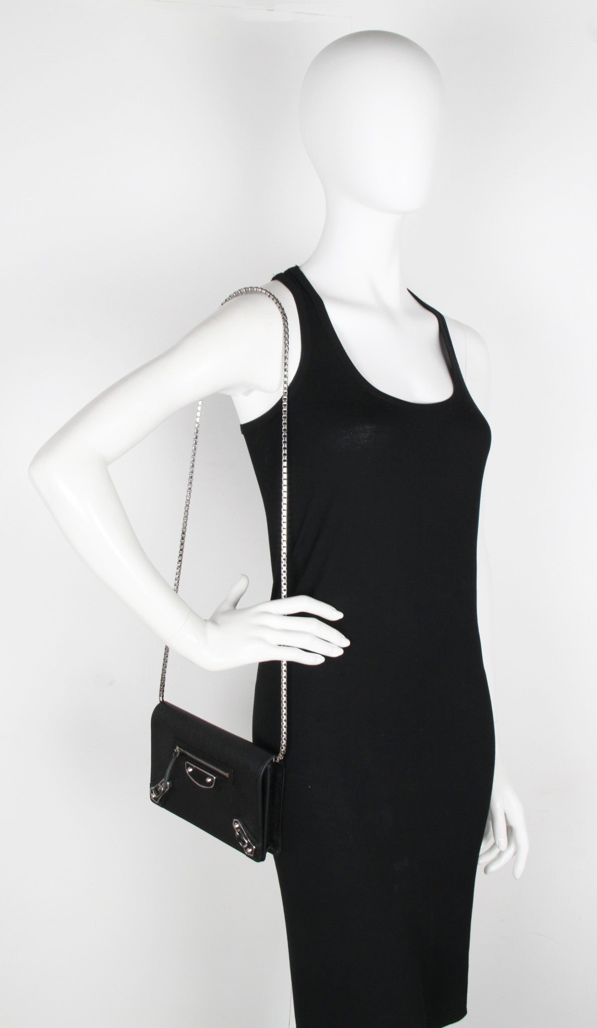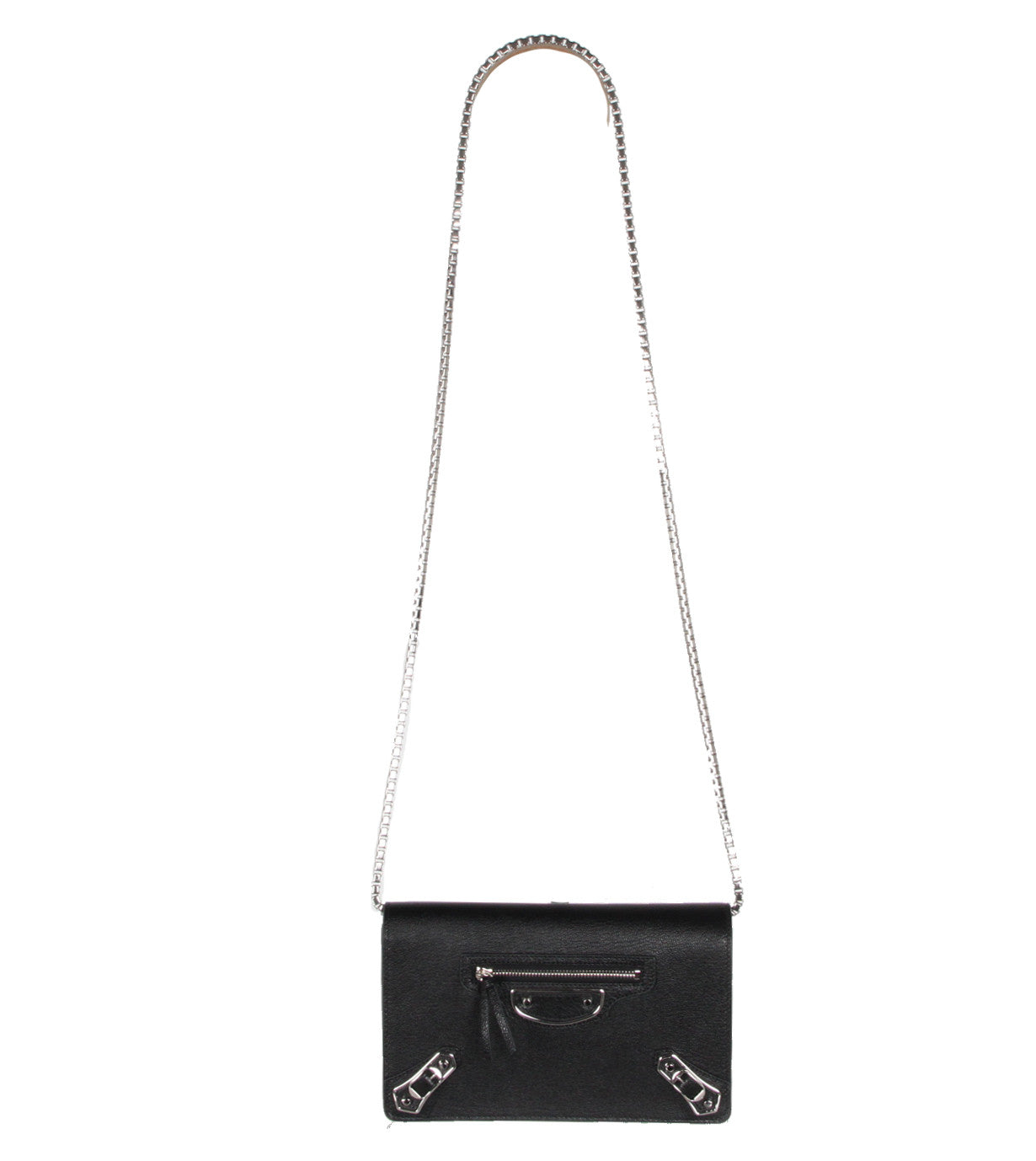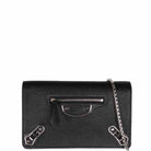 Balenciaga City Wallet on Chain bag finished with the signature metallic edge hardware, a chain strap and interior card slots.