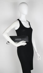 Balenciaga Logo clutch with built in card hard holders and a zip closure.