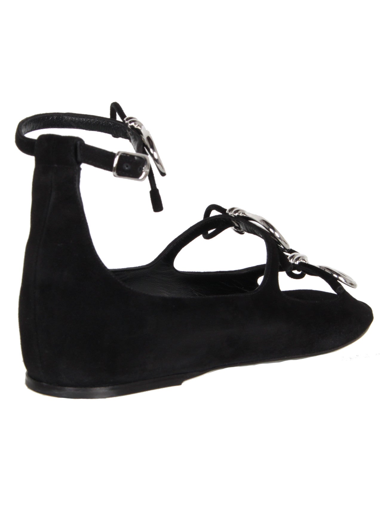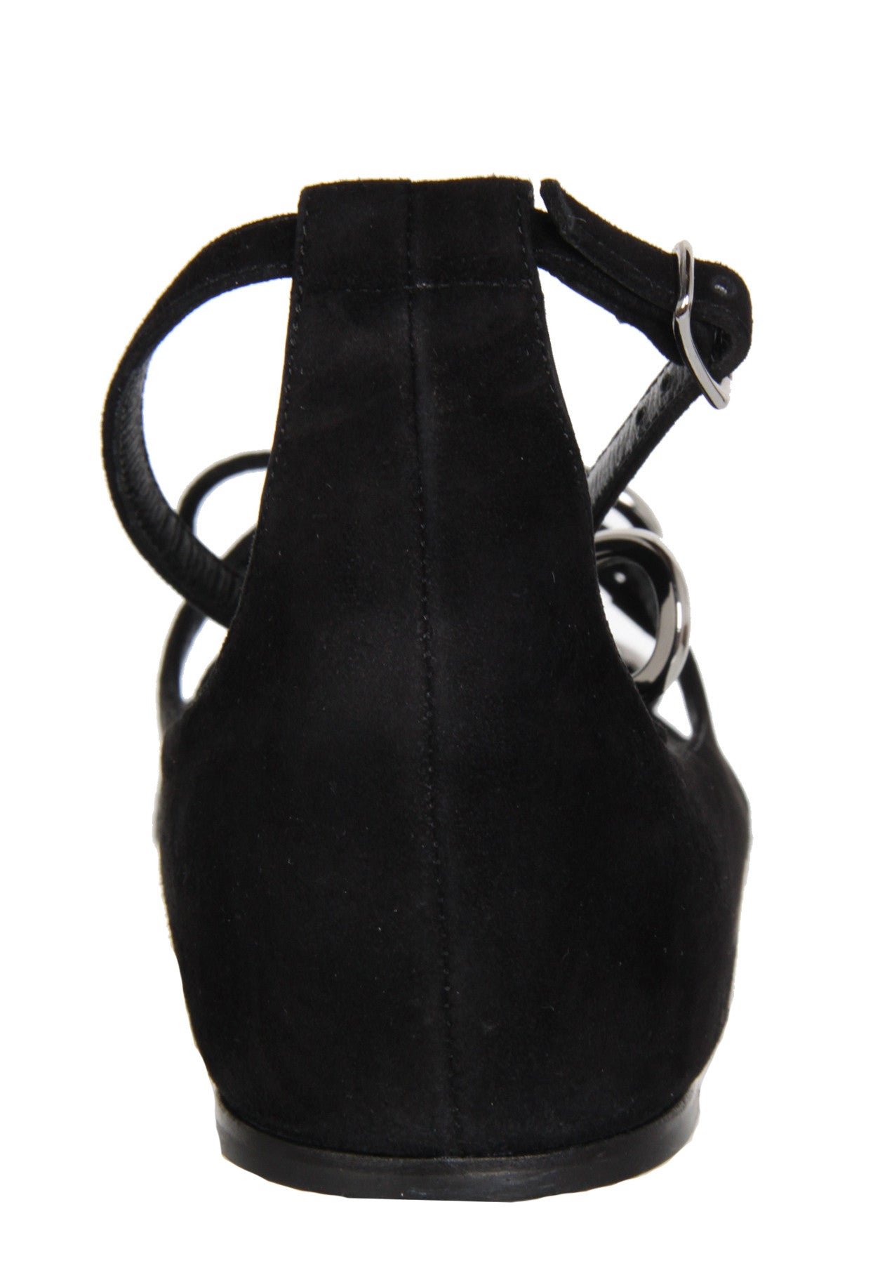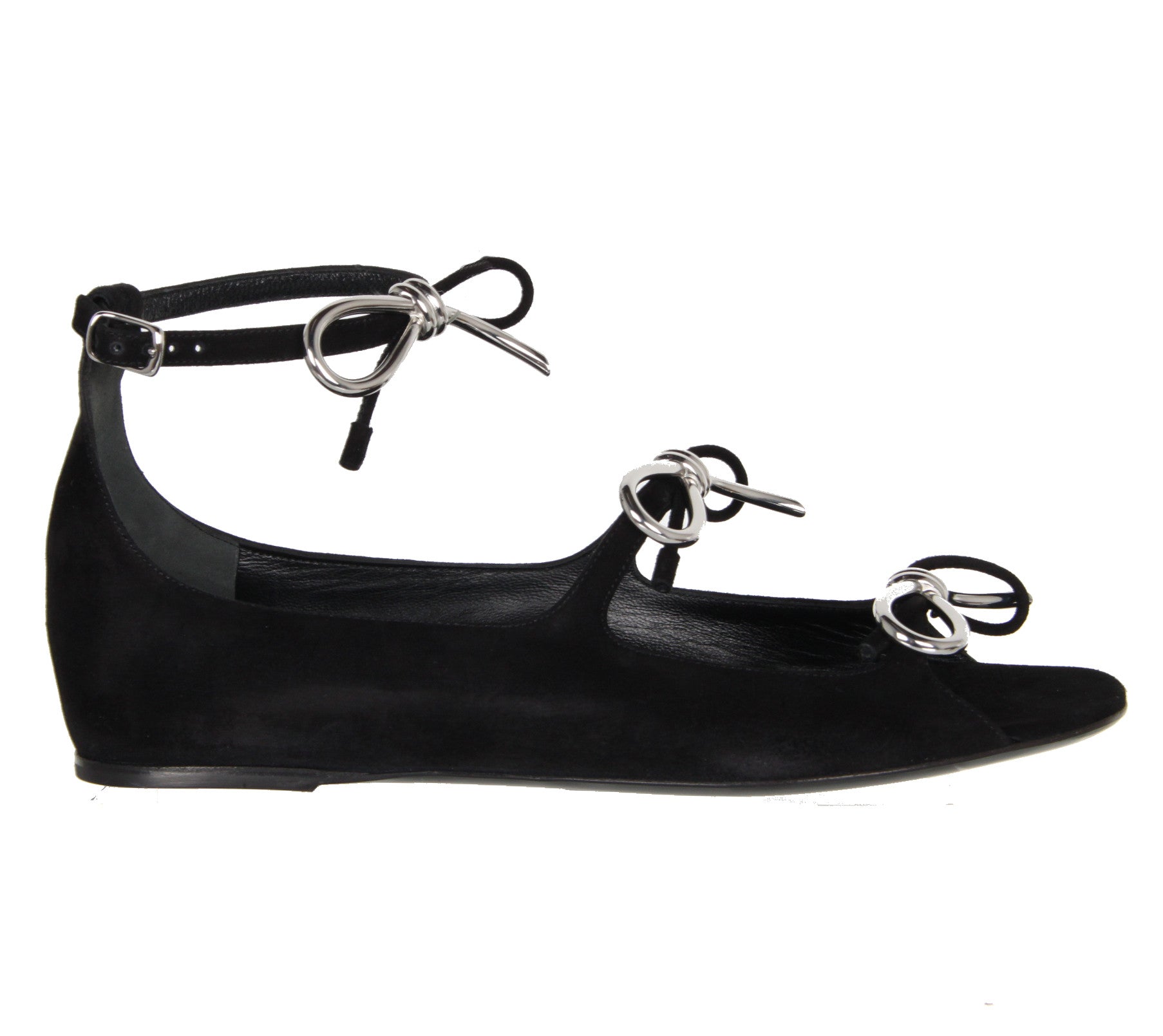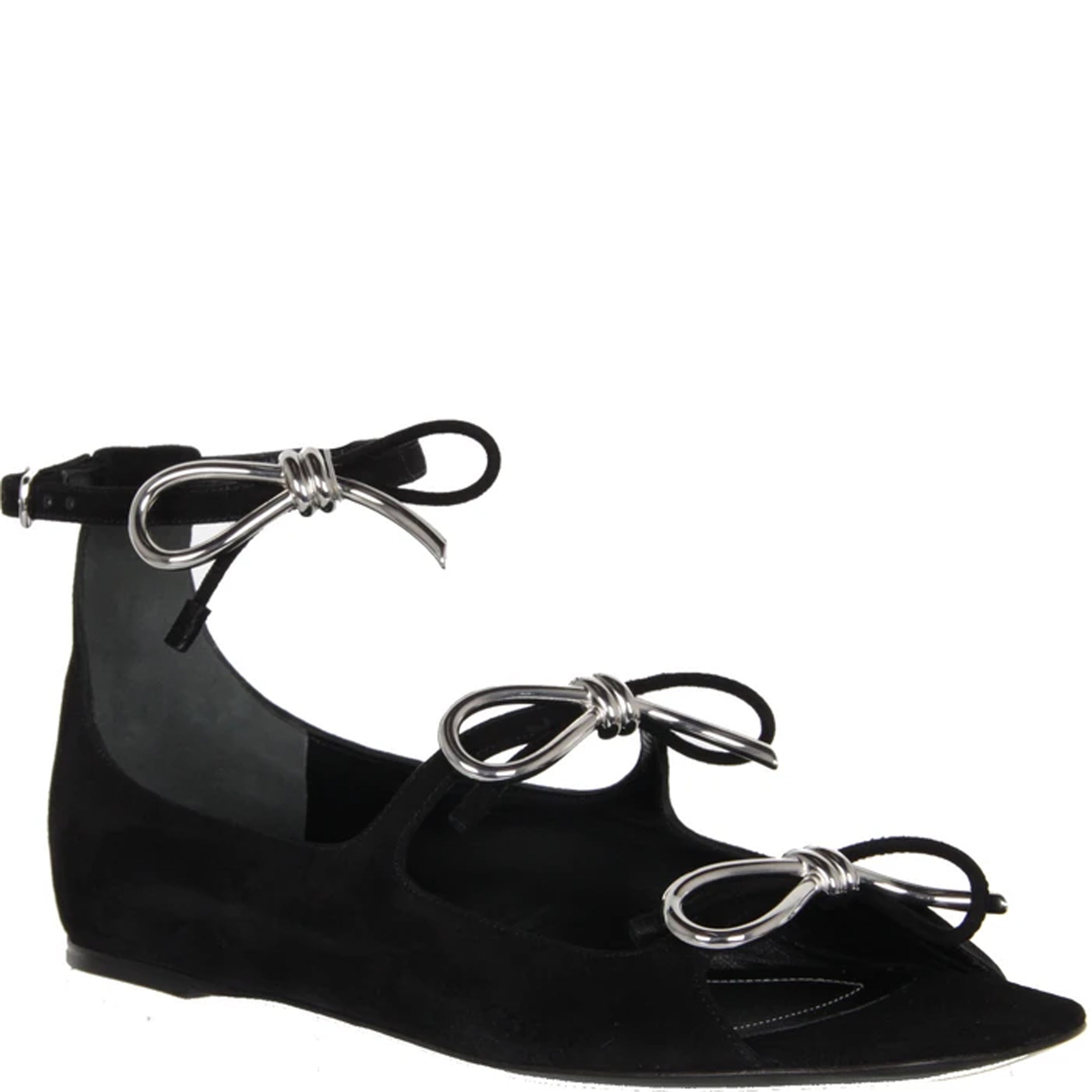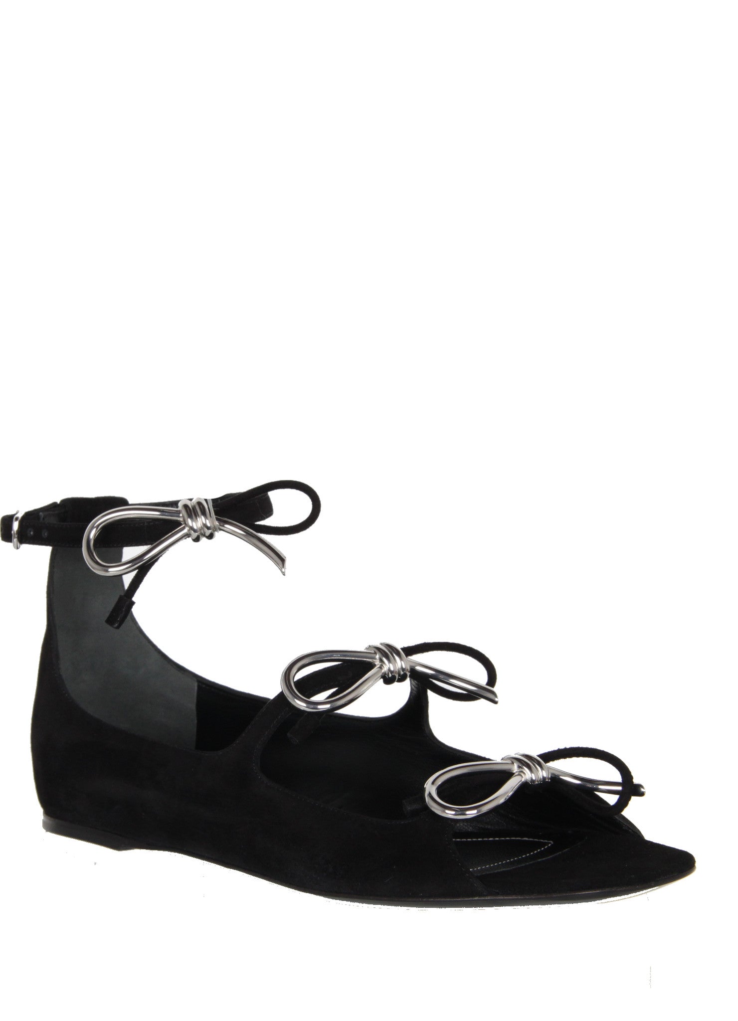 Black Goatskin (suede) open toe flat sandals with palladium metal and leather bow details.
