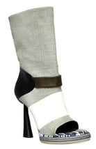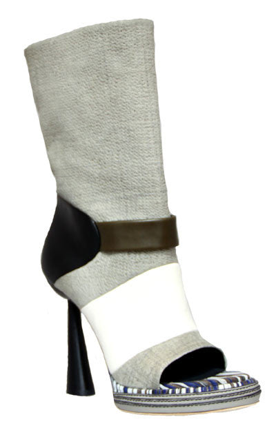 Mid-calf length peep toe boot. The striped coloured pattern at the front of the shoe is made by using different colour leather compressed and adhered together using a special technique. The base of the shoe also has leather stitched layering detail.