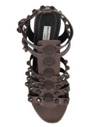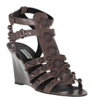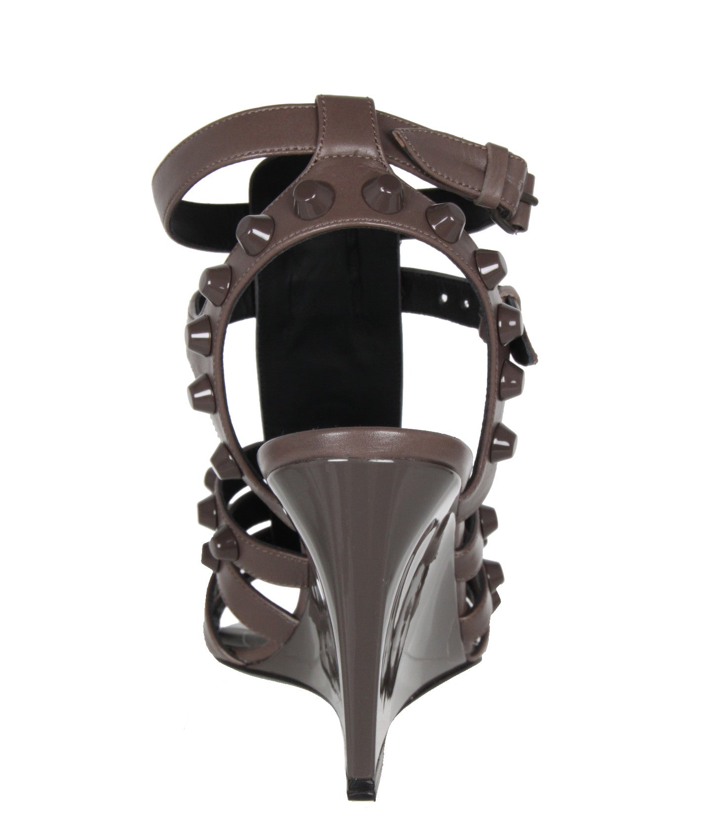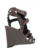 Asphalte wedge heel sandal in arena lamb skin featuring double buckled ankle straps, and Balenciaga tonal stud detailing on the straps.