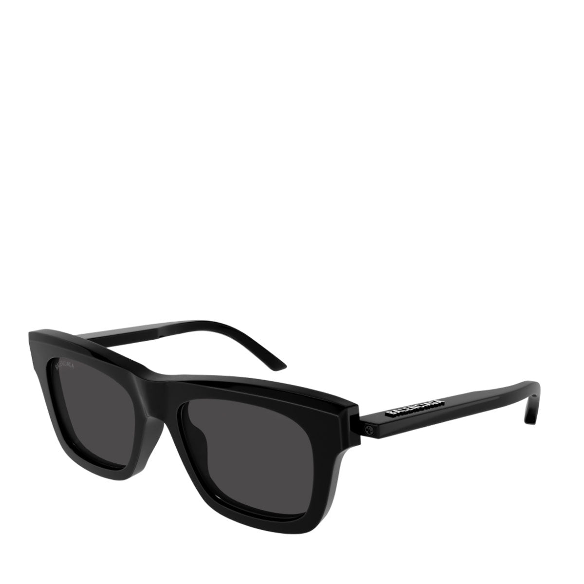 Balenciaga BB0161S sunglasses made with high density acetate frames, fitted with sleek grey lenses. Reverse Rectangle shape. Acetate front with injected temples. BALENCIAGA high relief logo on left temple with white padprinting. Iconic metal screws on temples front view.