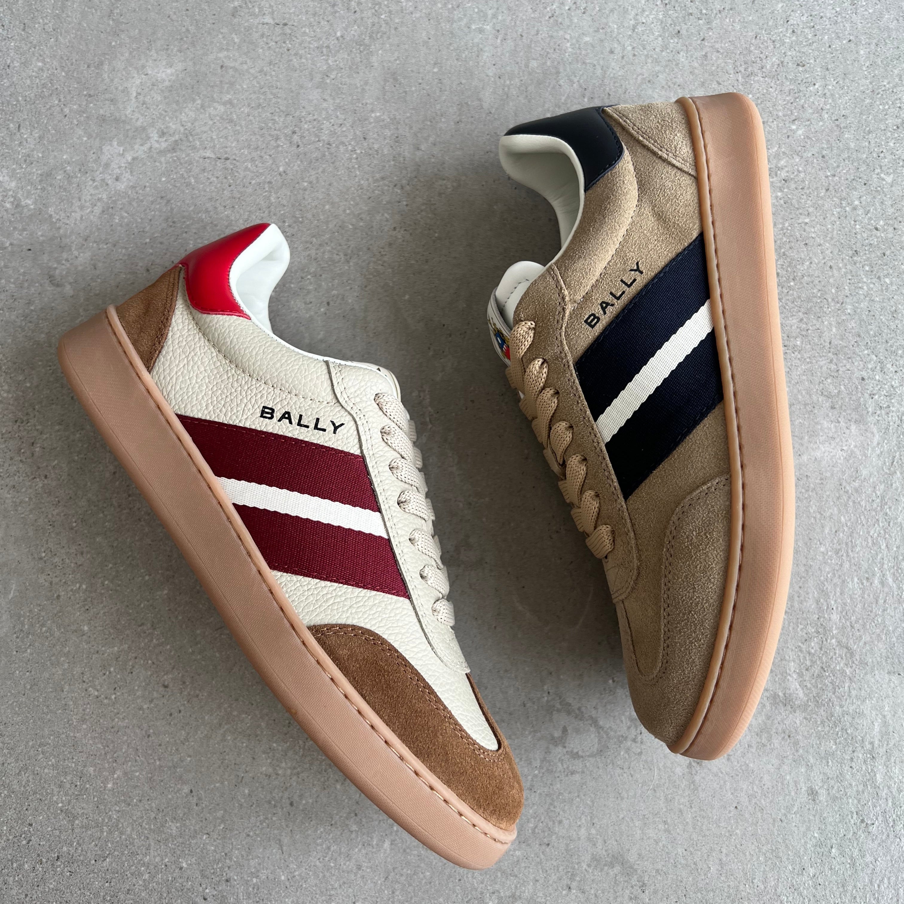 A grosgrain Bally Ribbon decorates the side of these retro crest sneaker in taupe suede with suede trim and a natural-hue rubber sole. On the tongue, a Bally Crest label in leather adds an iconic note to this lace-up style.