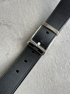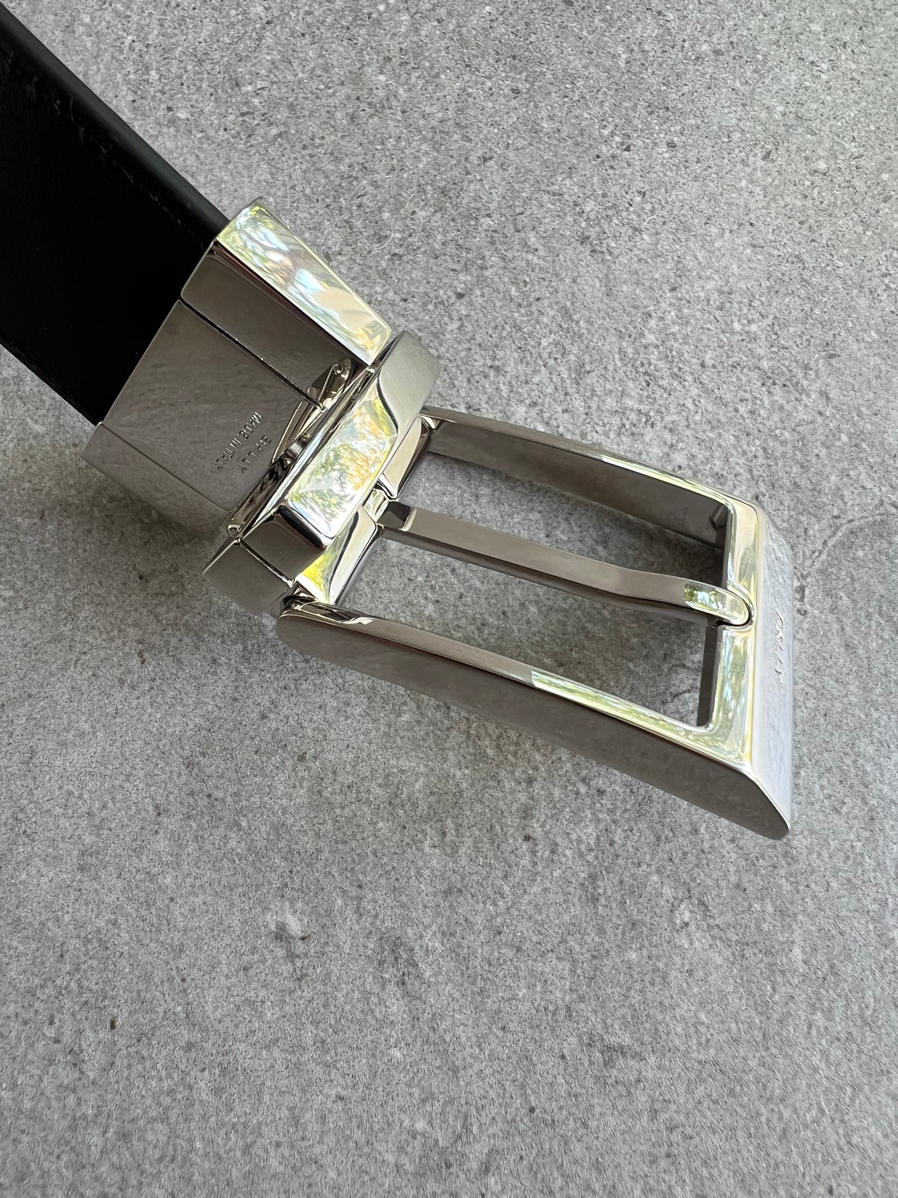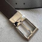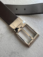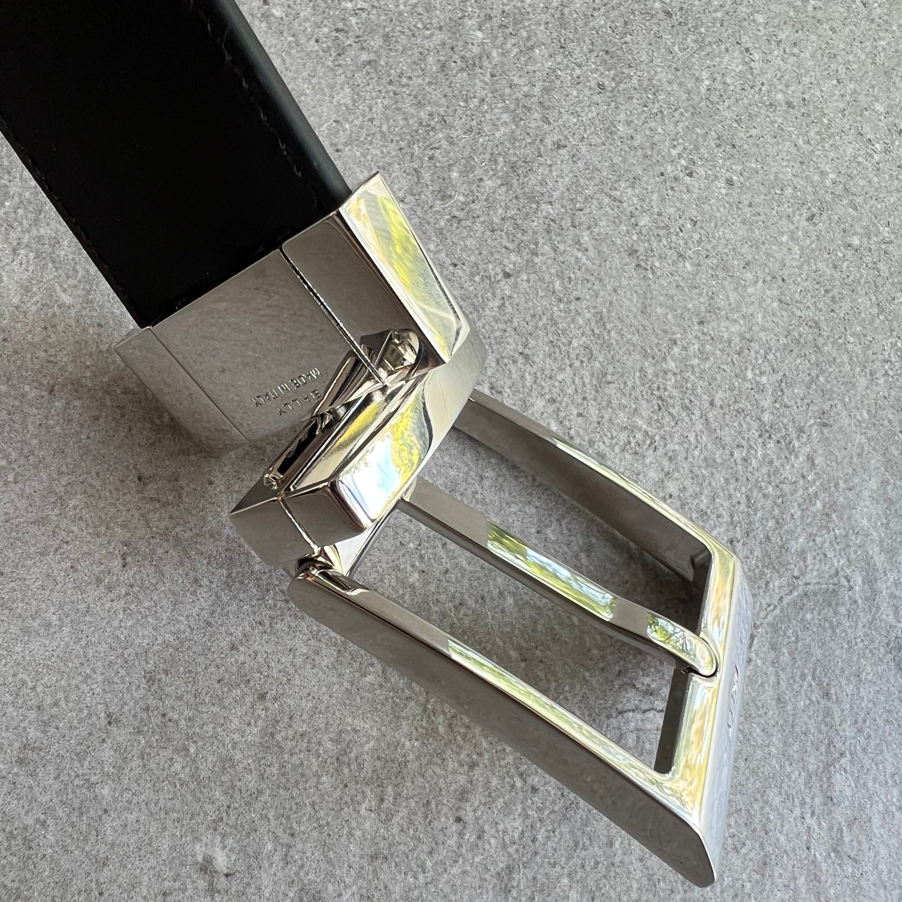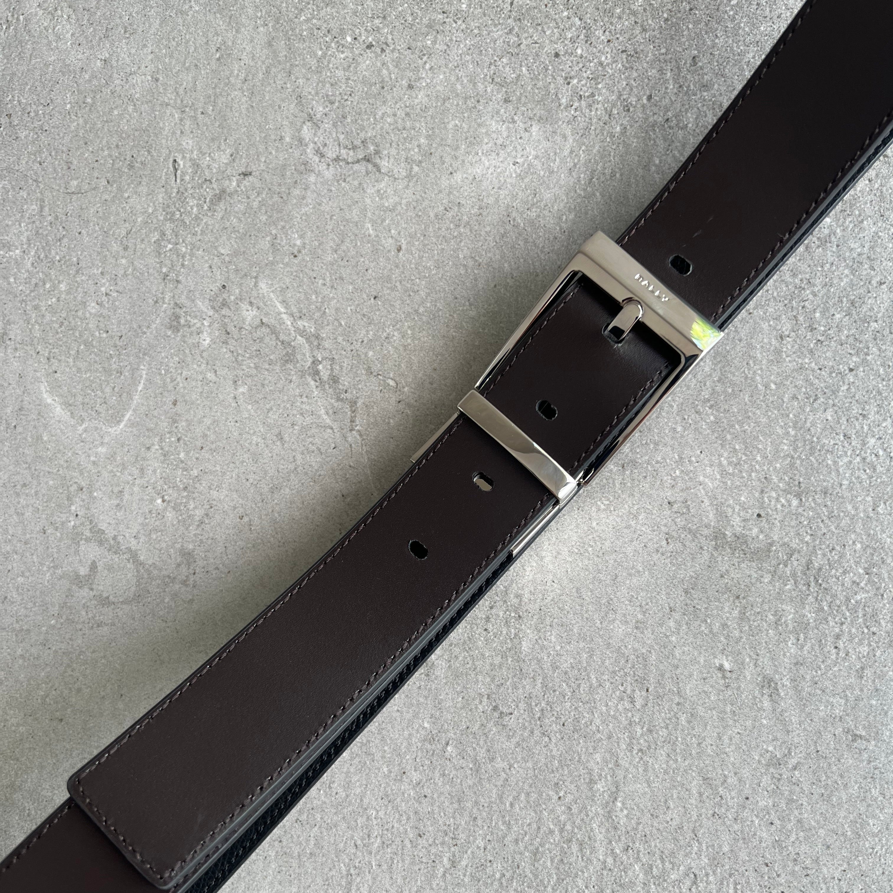 Adjustable and reversible, the Shiffie 35mm belt offers a choice of brown or black leather. The rectangular buckle at the front, in polished paladium-tone metal, is embellished by an essential debossed Bally logo. Black leather has a small grain finish on the leather and the Ebano brown side is a polish calf finish