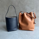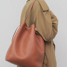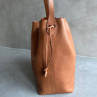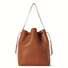 Classic tote bag in polished saddle leather with raw edge construction, drawstring closure with topstitching, and flat handle. Interior zip and slip pockets.