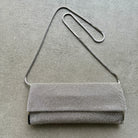 Adorned with two metal oval metal plates and made of pure silk satin and crystal mesh, the Kate features and adjustable shoulder strap that allows for versitile styling and can be worn over the shoulder or cross body in addition to being worn as a clutch bag.