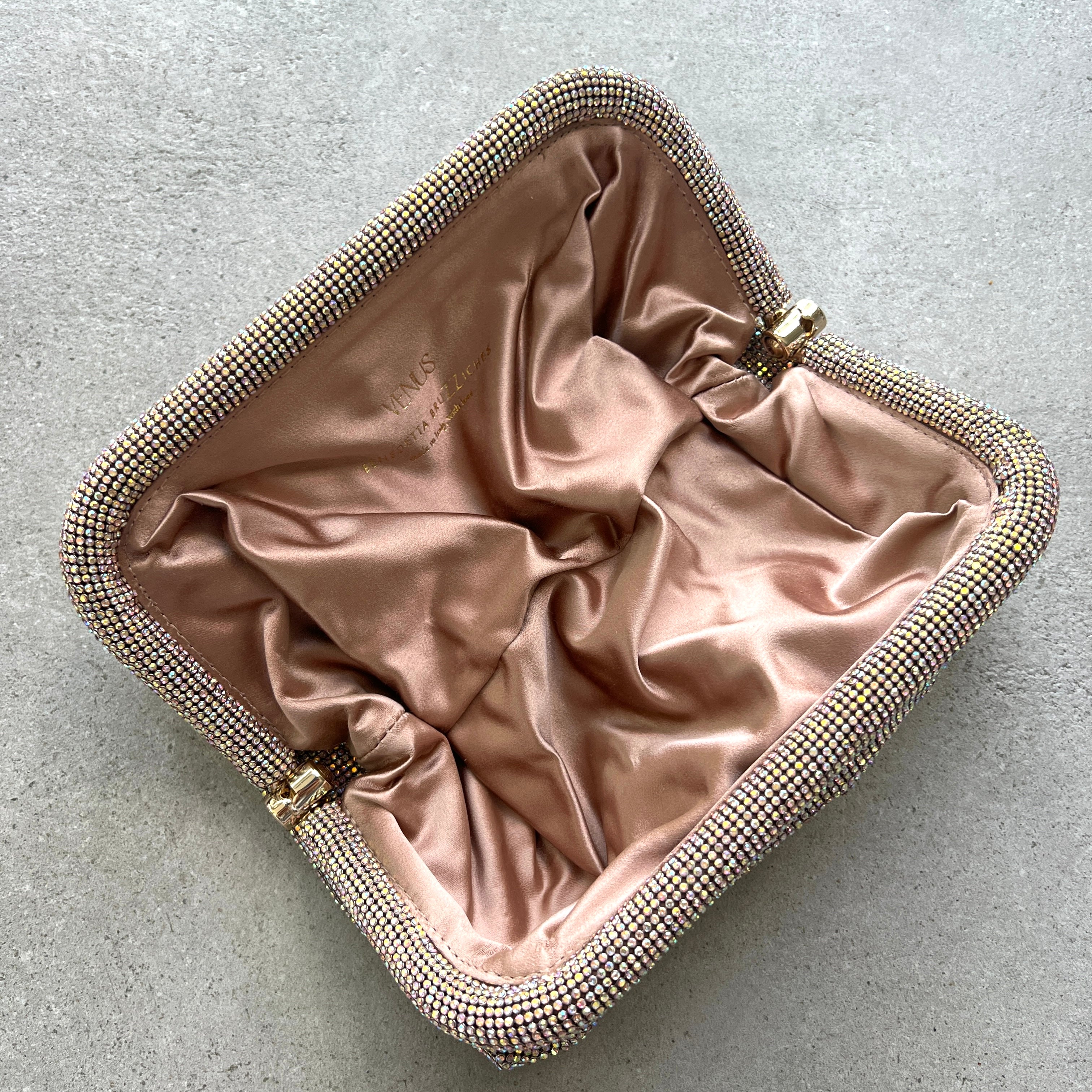 Benedetta Bruzziches' 'Venus La Grande' clutch is inspired by the Roman goddess of love and beauty. Made from satin that's hand-sewn with scores of shimmering crystals, it has a slouchy shape and structured frame. There's just enough space for your lipstick, phone and cardholder inside.