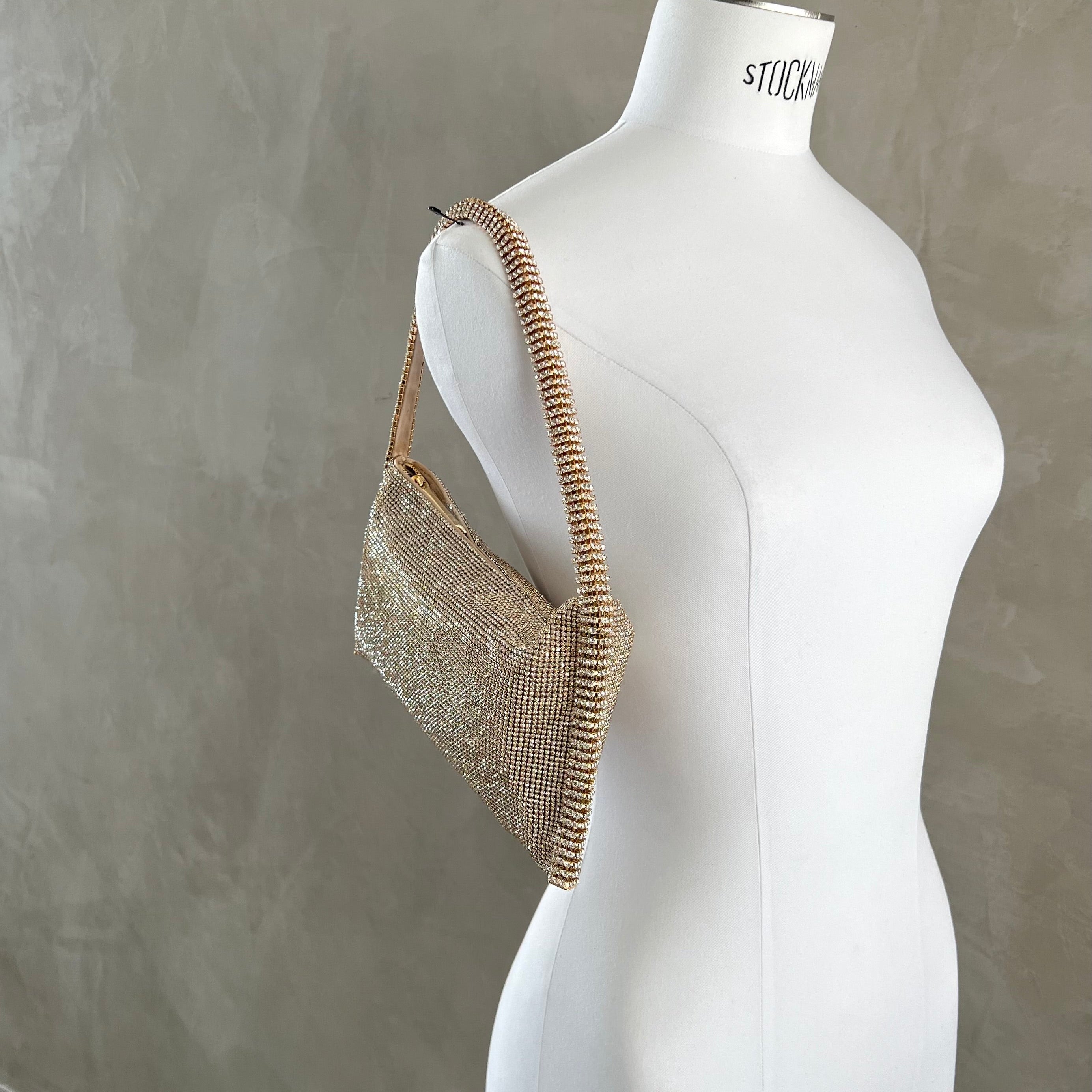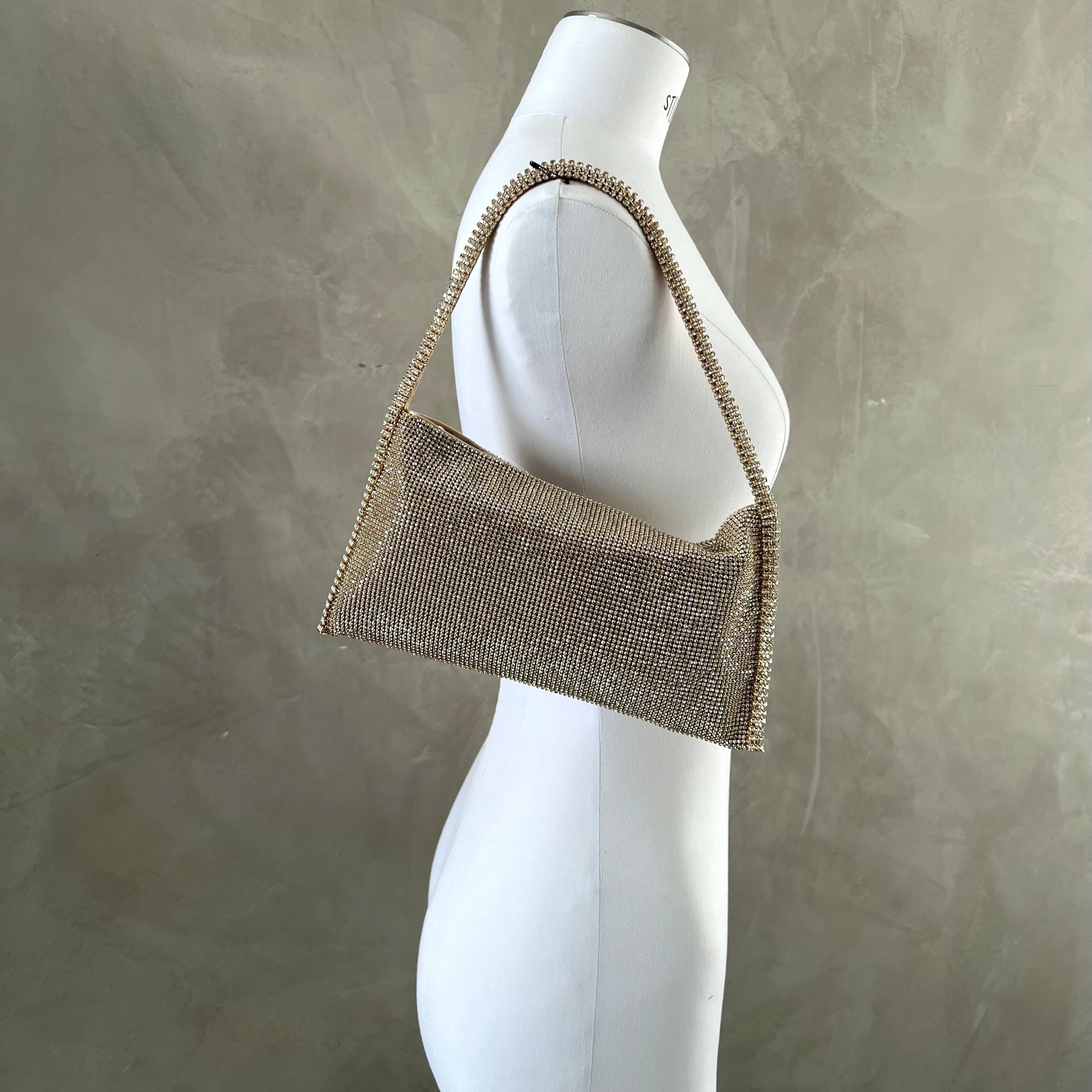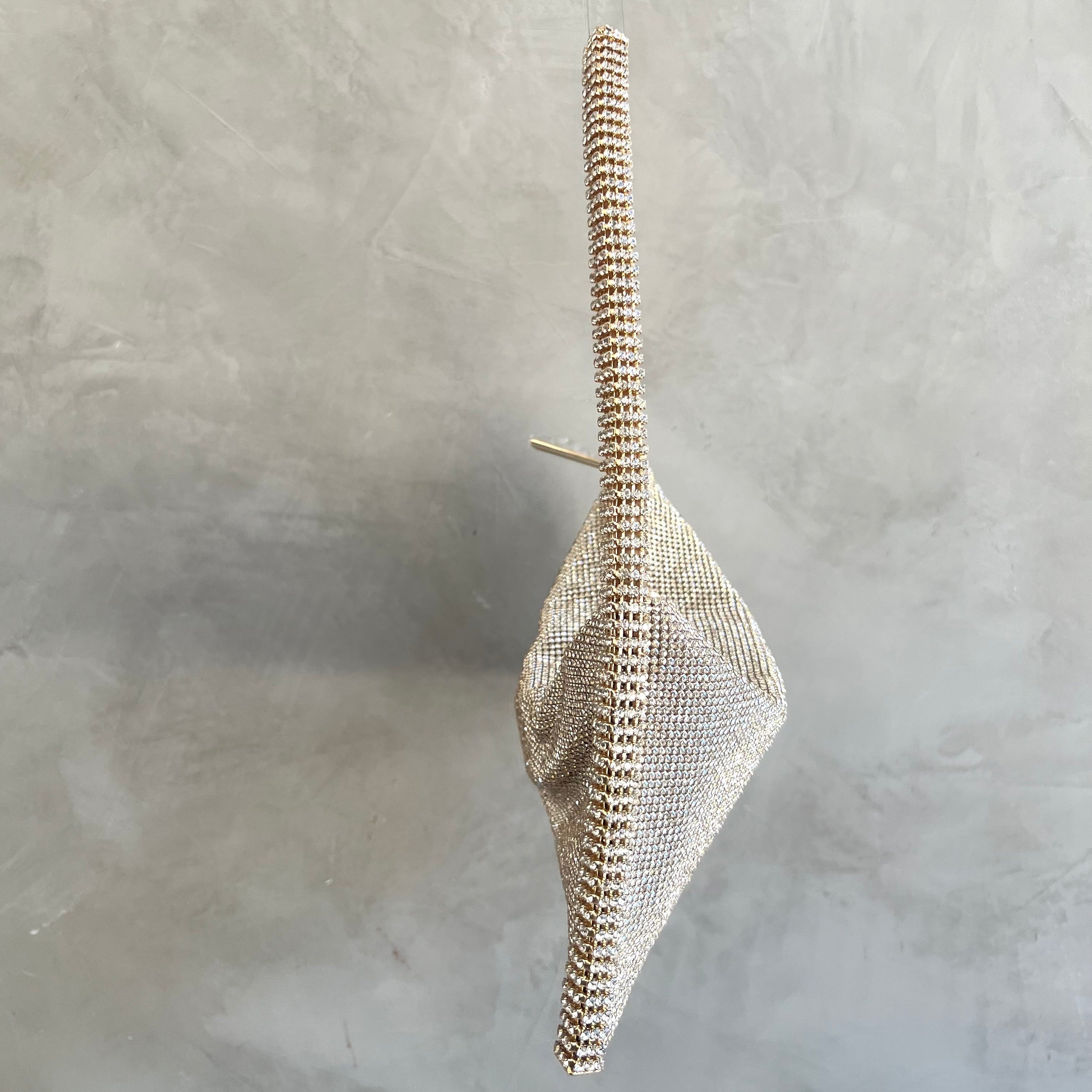 Aluminium mesh studded with crystal rhinestones on organic silk satin pouch.