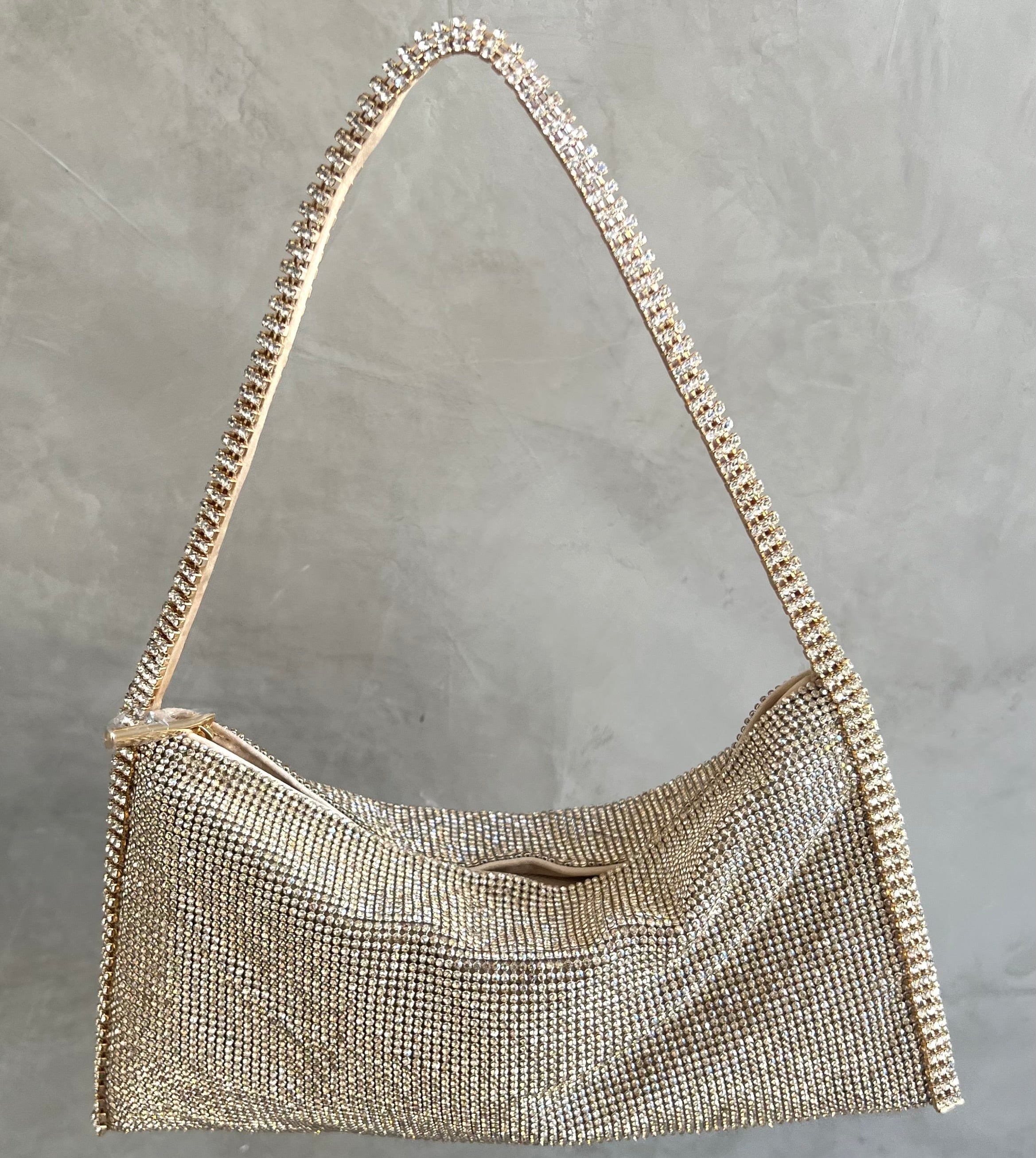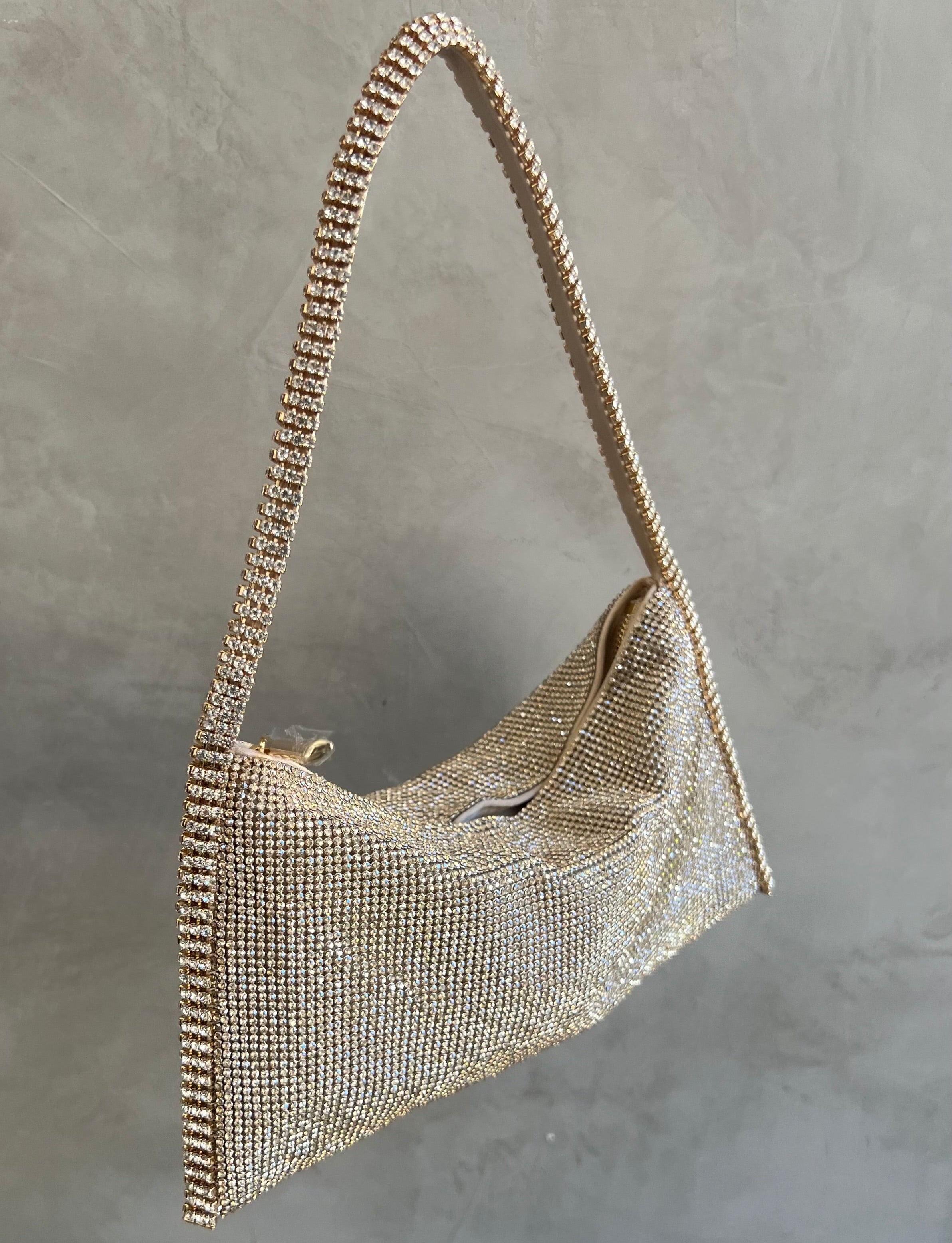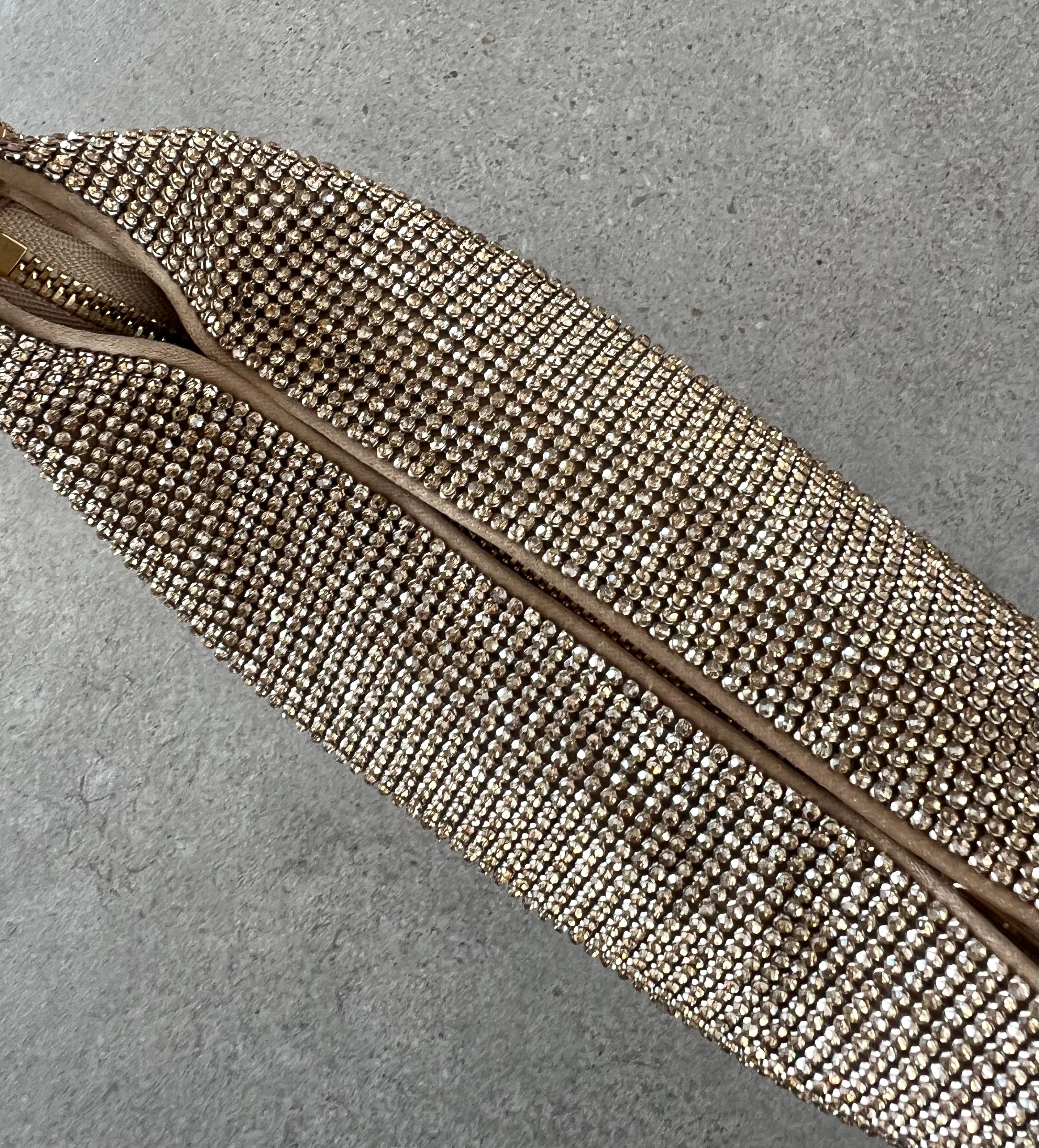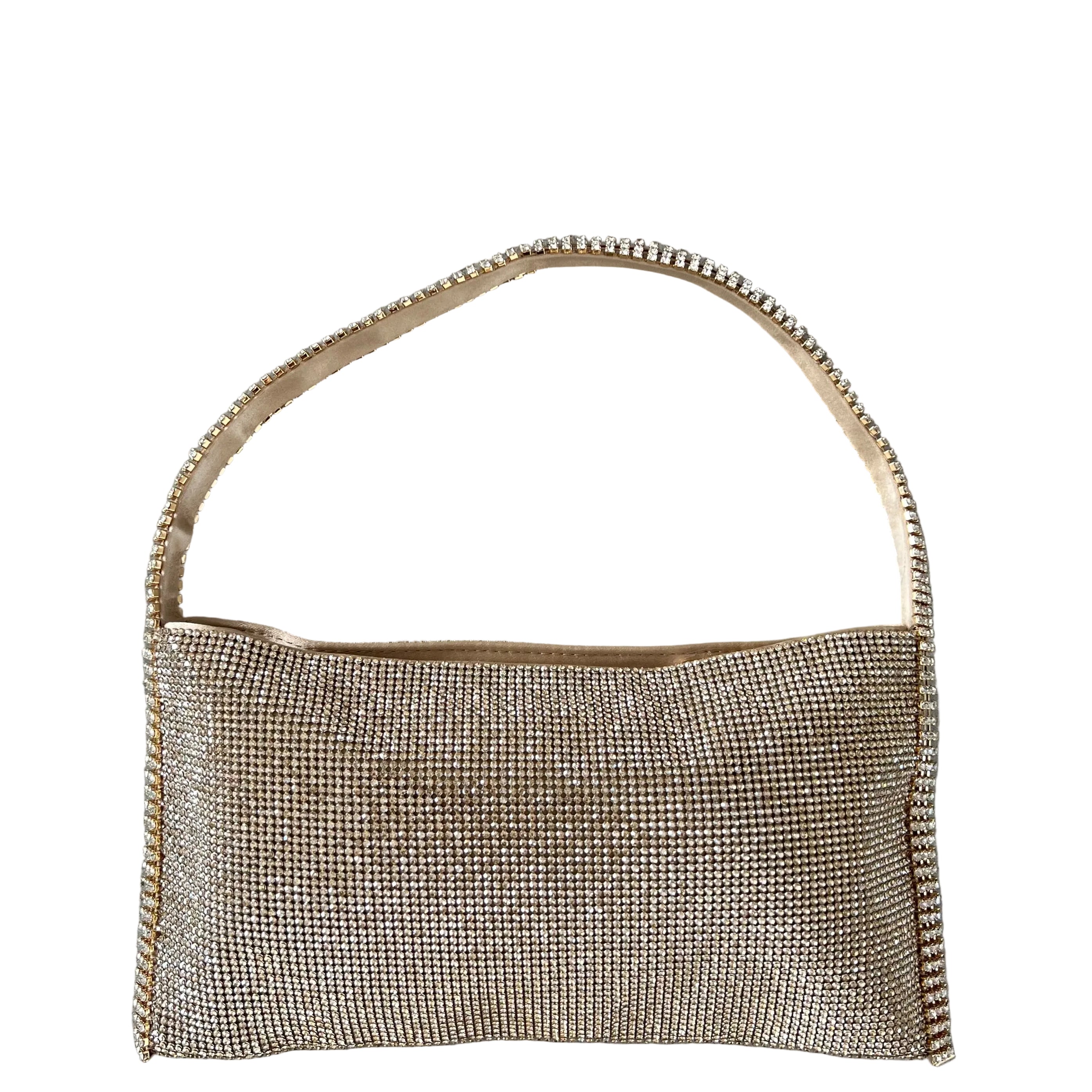 Aluminium mesh studded with crystal rhinestones on organic silk satin pouch.