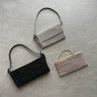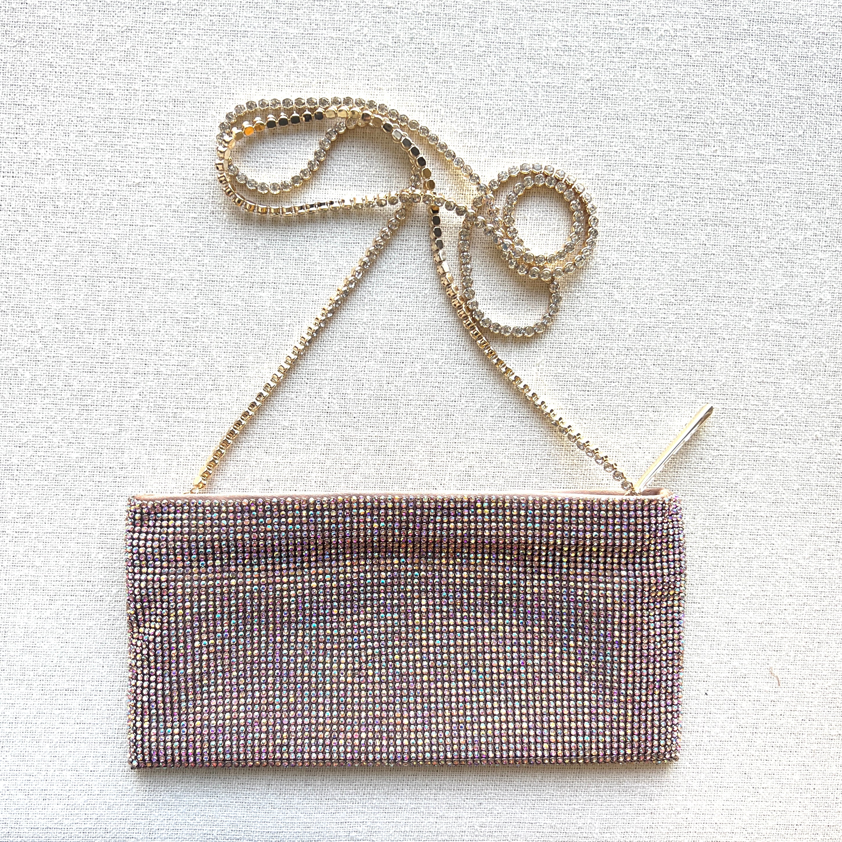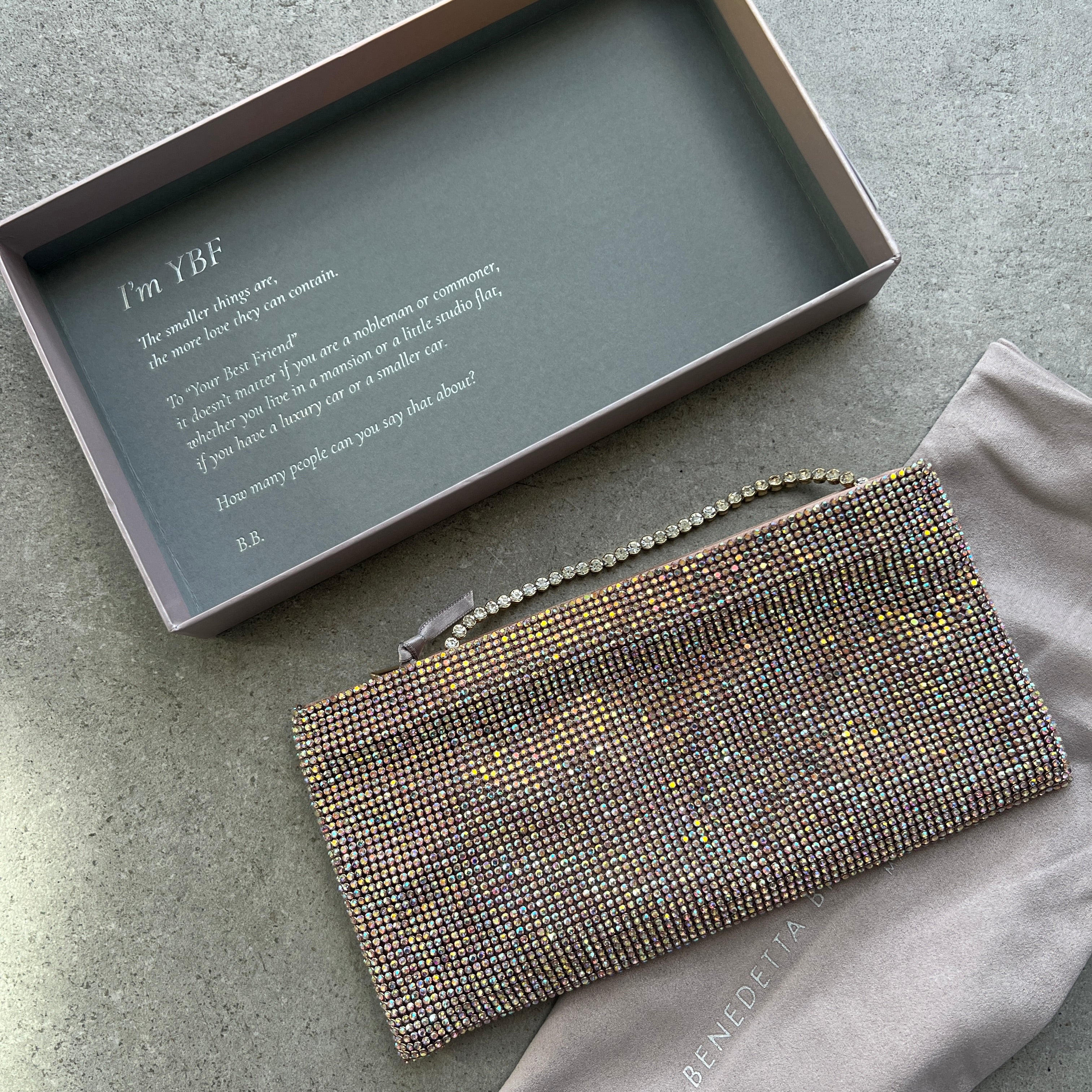 Designed to keep only what is really important, it is a mini clutch made with a soft net of crystals lined with denim, entirely hand-sewn. An elegant crystal shoulder strap allows you to wear it on the shoulder.