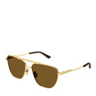 Bottega Veneta Minimalist Aviator sunglasses collection model BV1236S in shiny gold featuring solid brown lens. Inspired by Italian culture with a global outlook. Featuring faceted effects, sculptural contours, geometric profiles on acetate and the iconic three-dimensional ribbons.