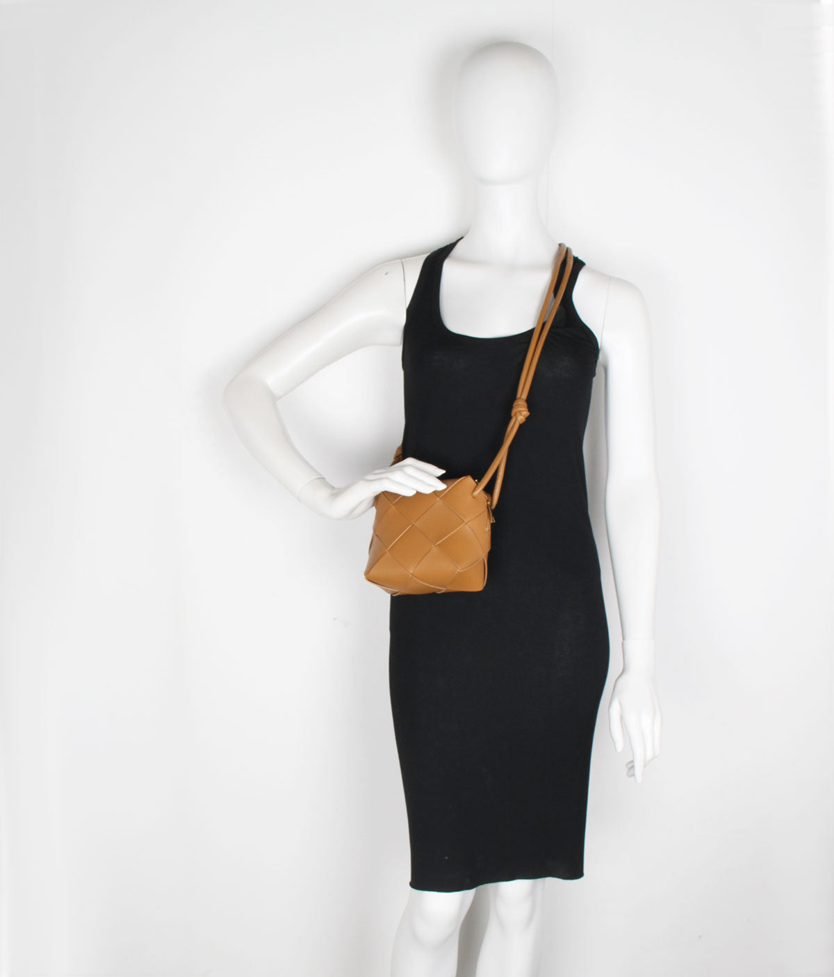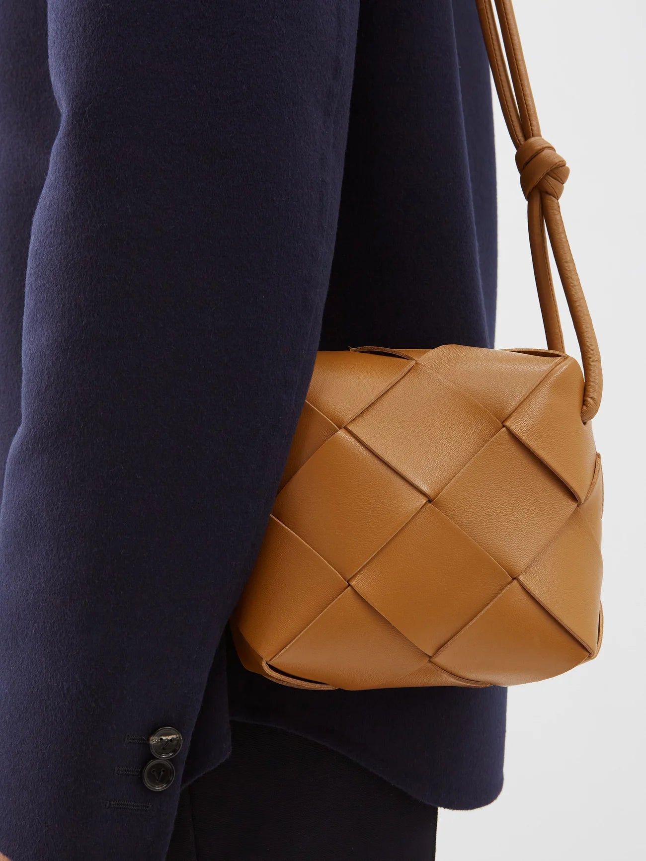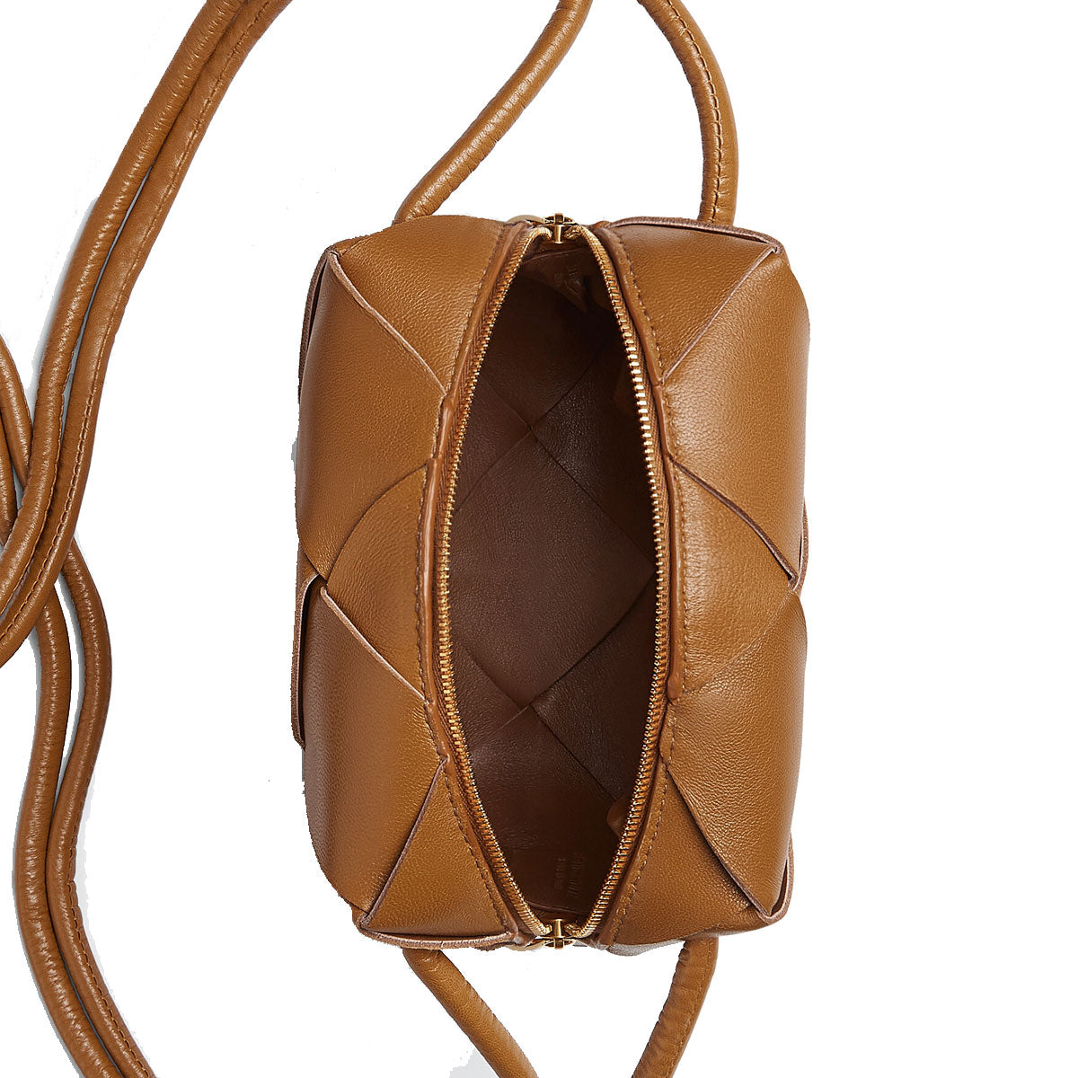 Bottega Veneta's signature Loop Mini bag is now available in their cassette weave. This crossbody bag has a soft edge boxy shape crafted from lamb leather and features double knotted side details on the strap, zip top closure and bonded lambskin lining.